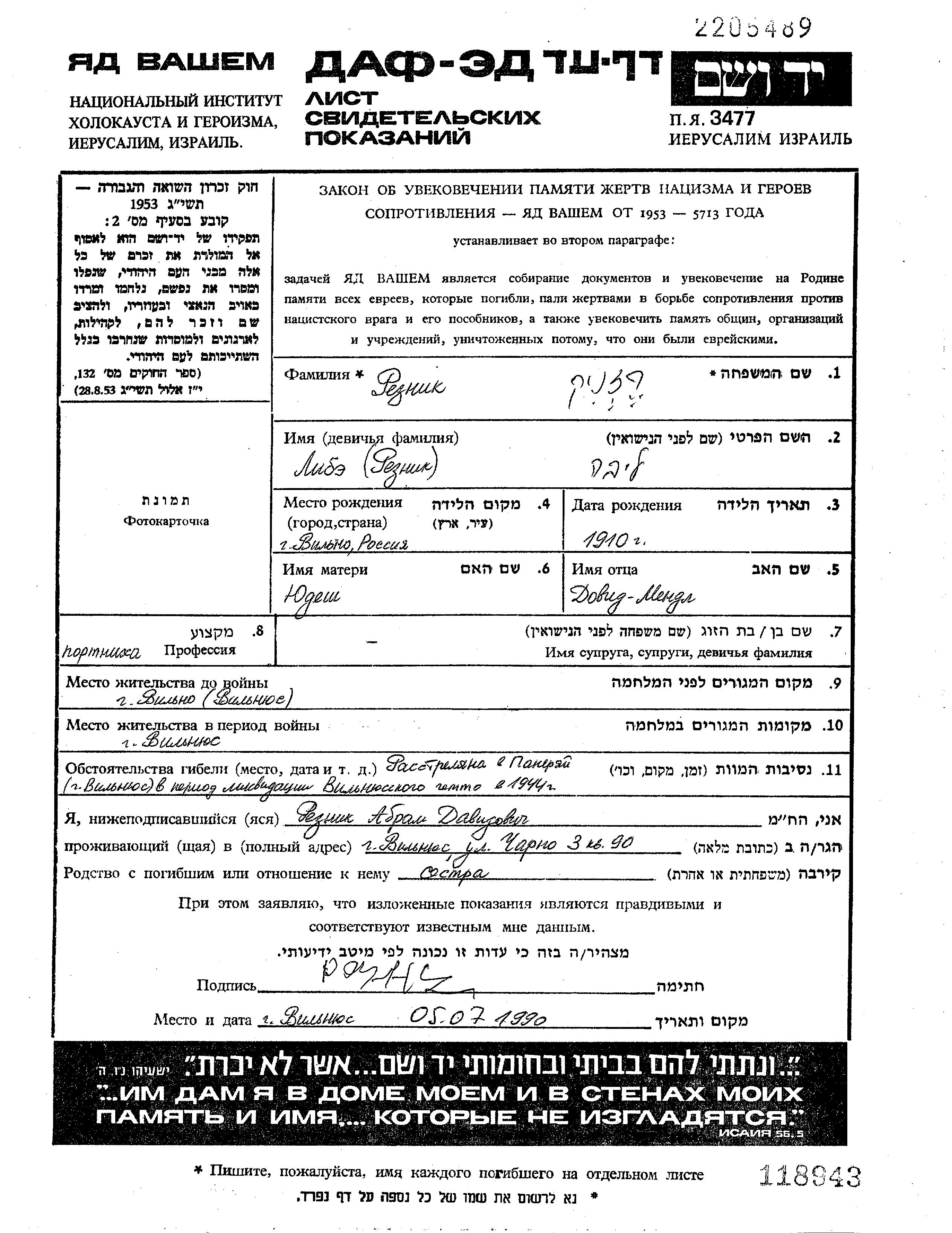 Резник Либа 1910 Вильно, Польша Лист свидетельских показаний