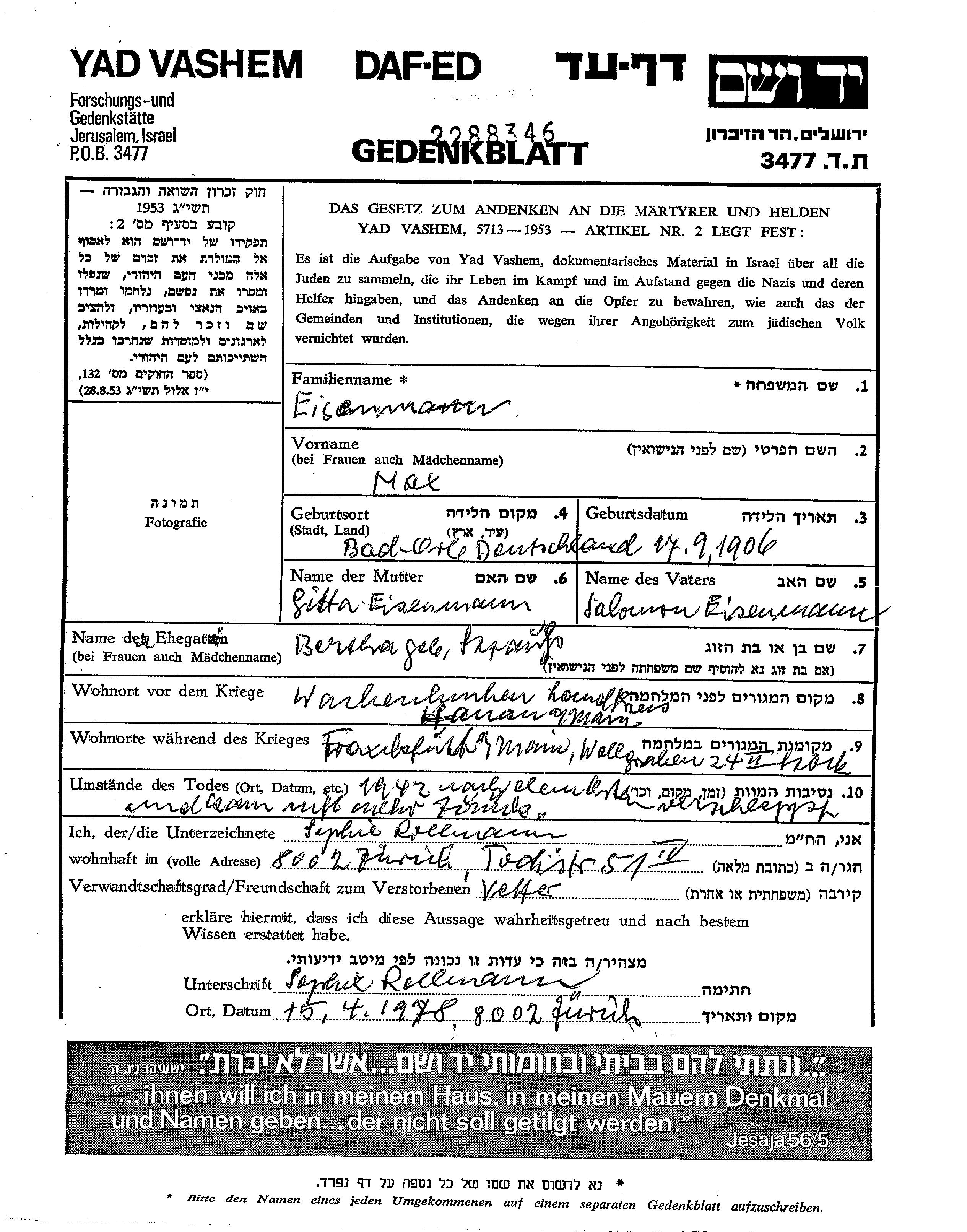 Макс Айзенманн, место рождения: Бад-Орб, Германия. Отец: Саломон, mать:Гитта, девичья фамилия Зонн. Женат / замужем. Место жительства до войны: Ханау-на-Майне, Германия. Место во время войны: Франкфурт-на-Майне, Германия.