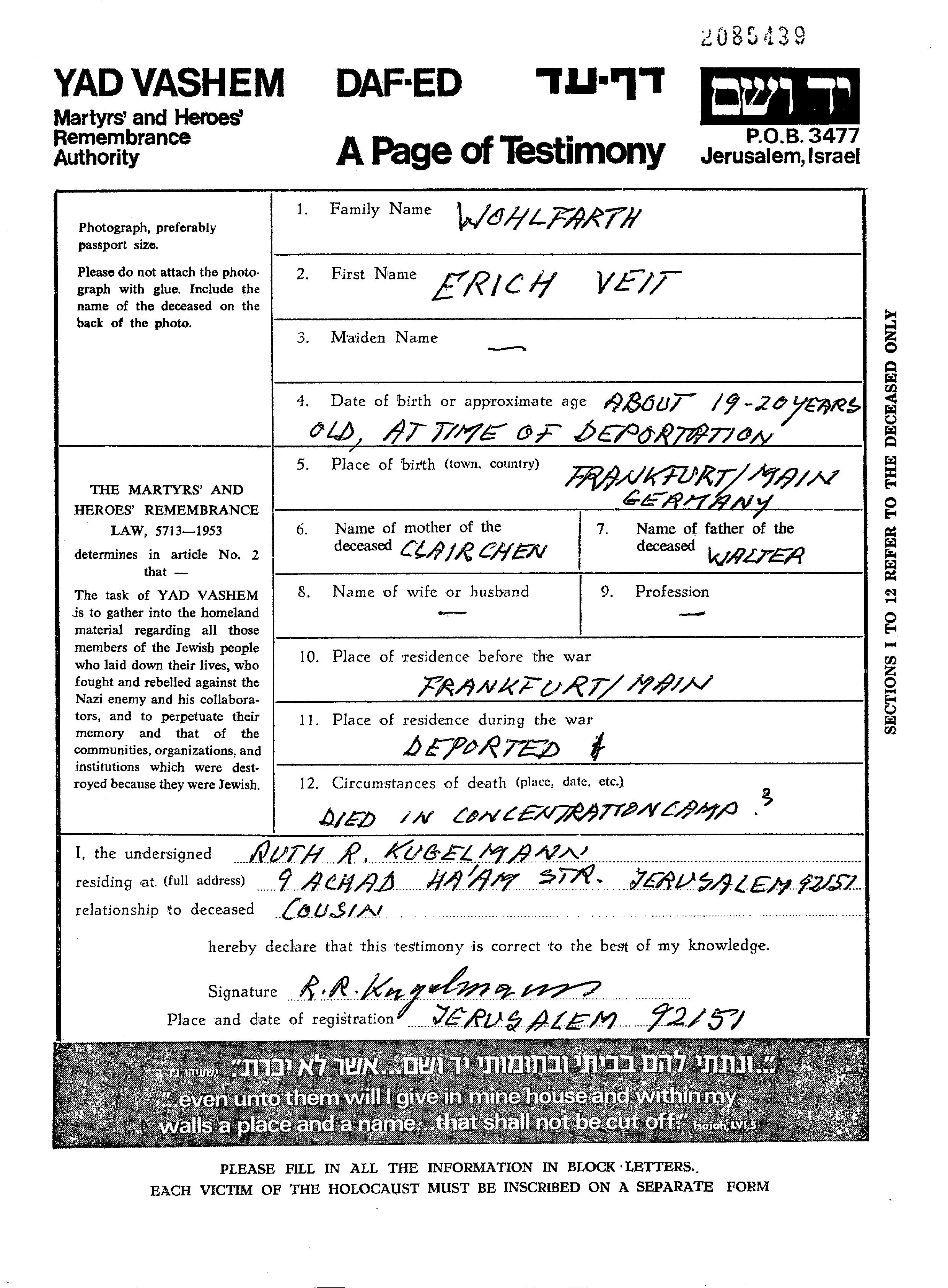 Эрих Файтель Вольфарт Вольперт, место рождения: Франкфурт-на-Майне, Германия. Отец: Вальтер, mать:Клерхен, девичья фамилия Фридман. Холост / не замужем. Место жительства до войны: Франкфурт-на-Майне, Германия.