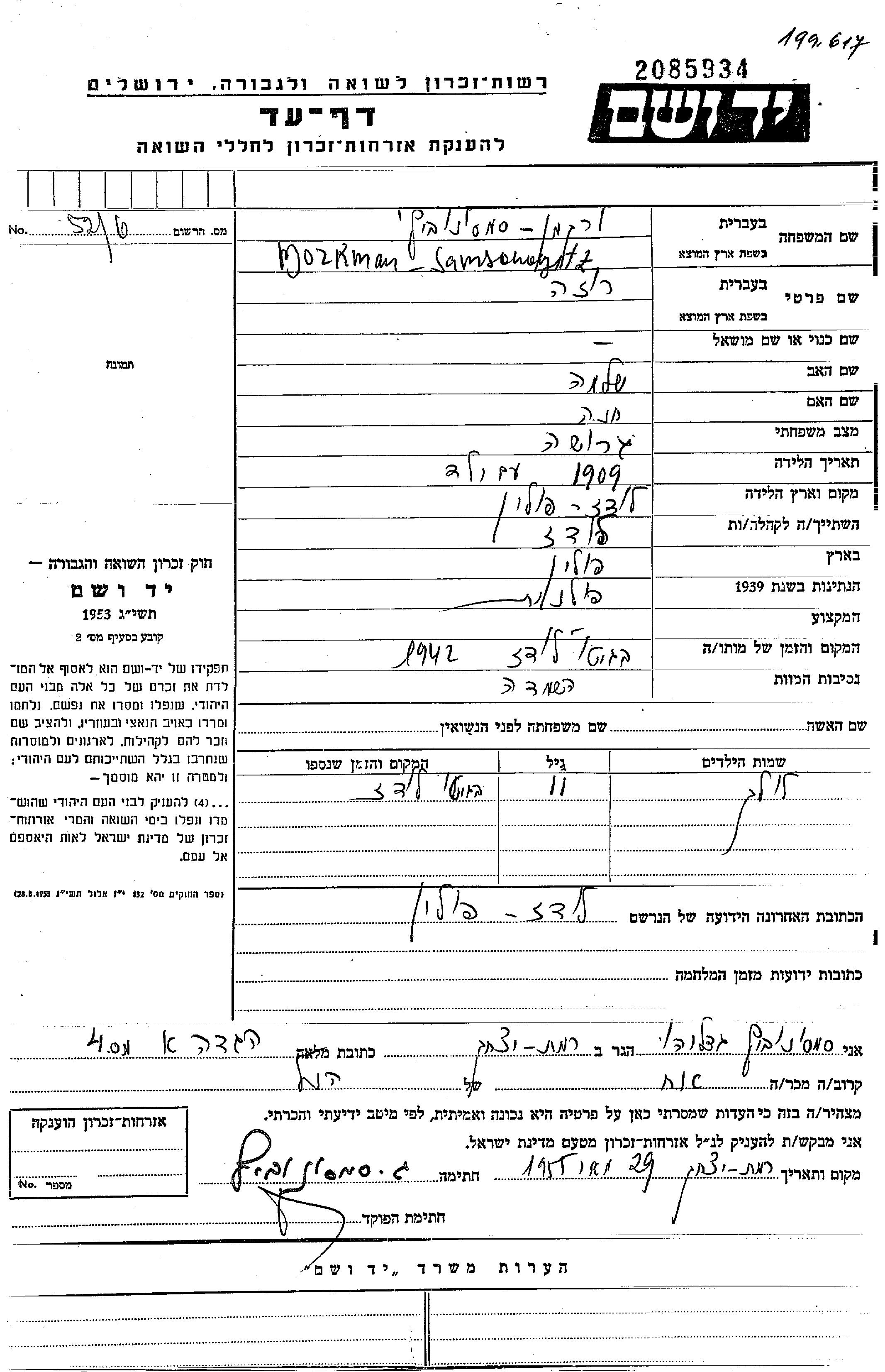 Воркман Самсоновиц Роза 1909 Лодзь, Польша Лист свидетельских показаний