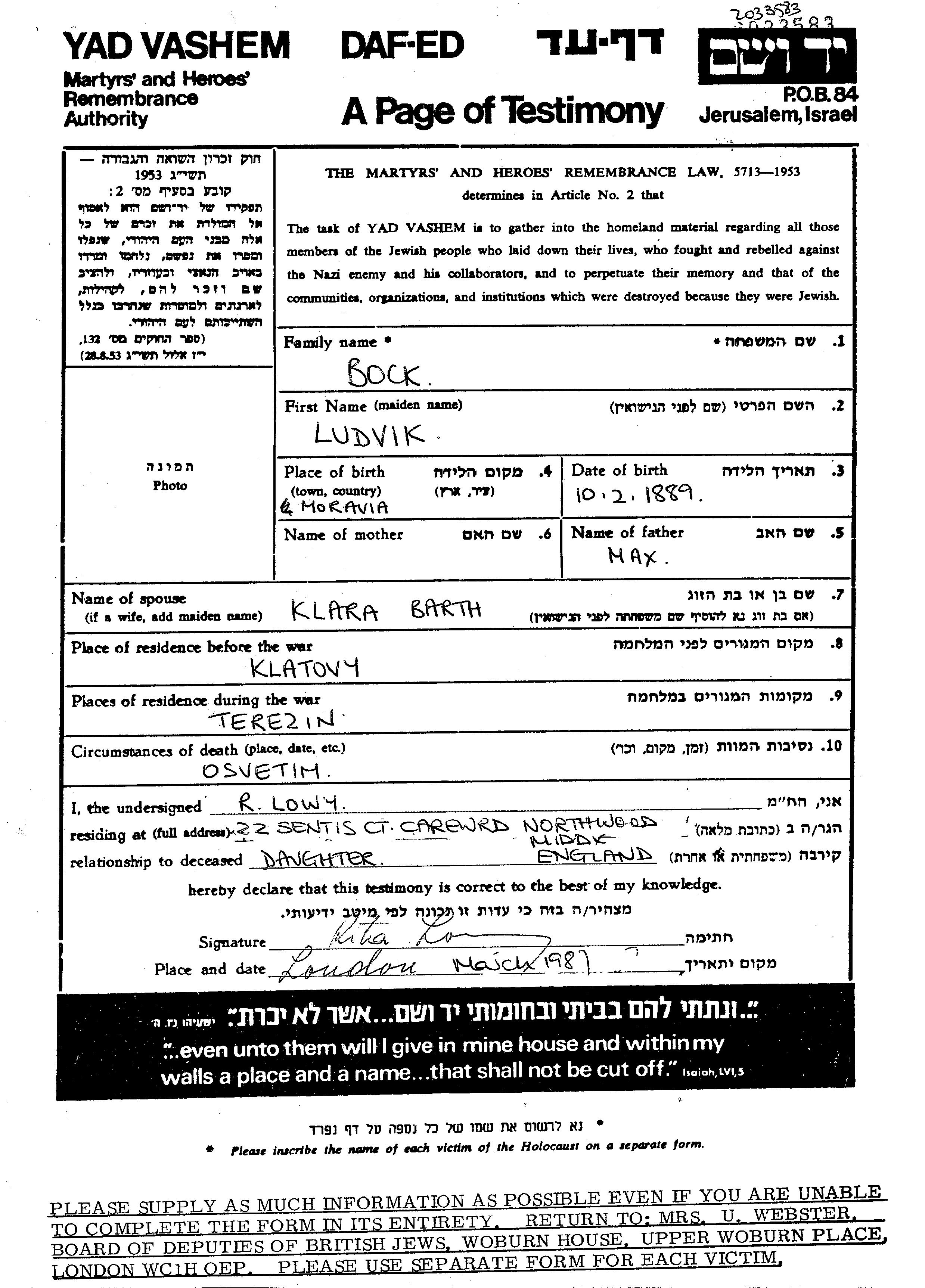 Лудвик Бок Бук, место рождения: Чехословакия. Отец: Макс. Женат / замужем. Место жительства до войны: Tupadly, Чехословакия.