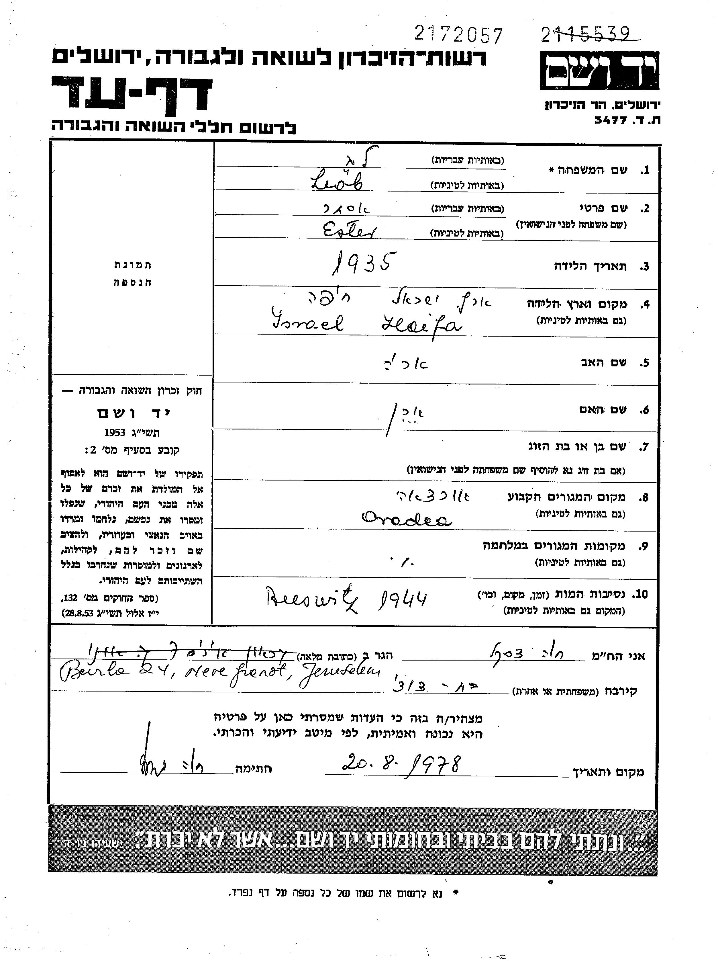 Леоб Лев Эстер 1935 Орадя, Румыния Лист свидетельских показаний