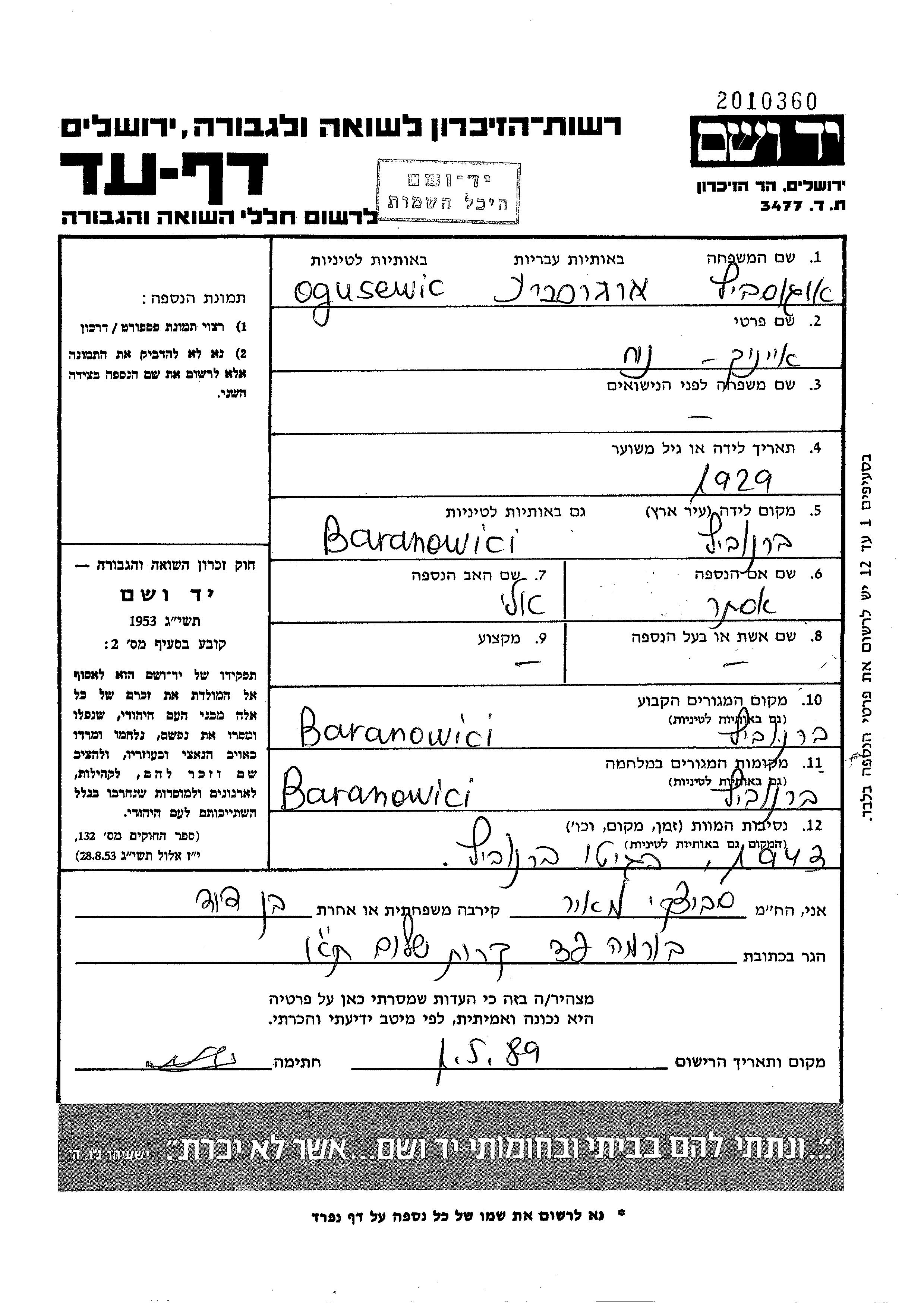 Огусевич Эйних Ноах 1929 Барановичи, Польша Лист свидетельских показаний
