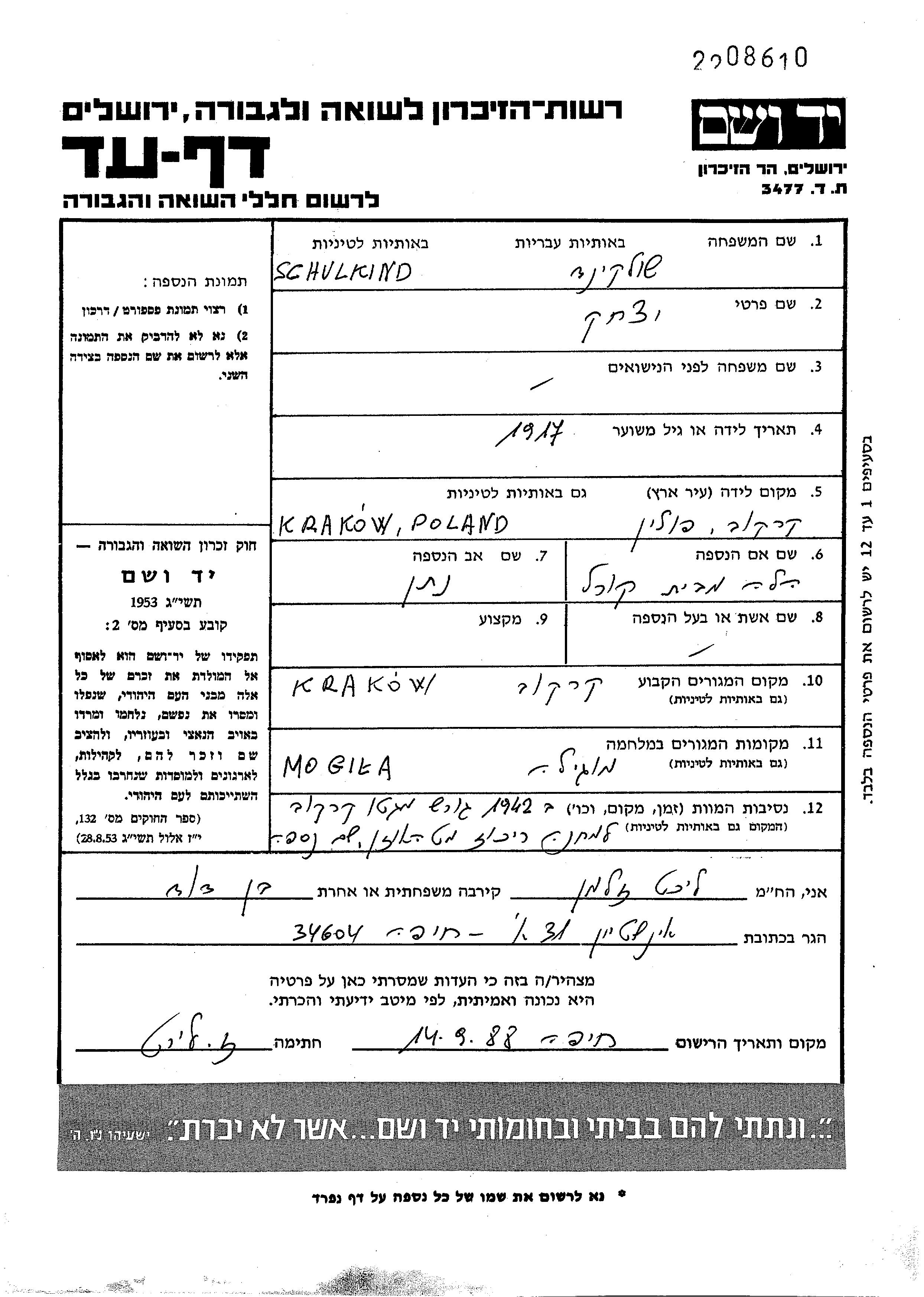 Ицхак Шулькинд, место рождения: Краков, Польша. Отец: Натан, mать:Хела, девичья фамилия Корель. Место жительства до войны: Краков, Польша. Место во время войны: Могила, Польша.