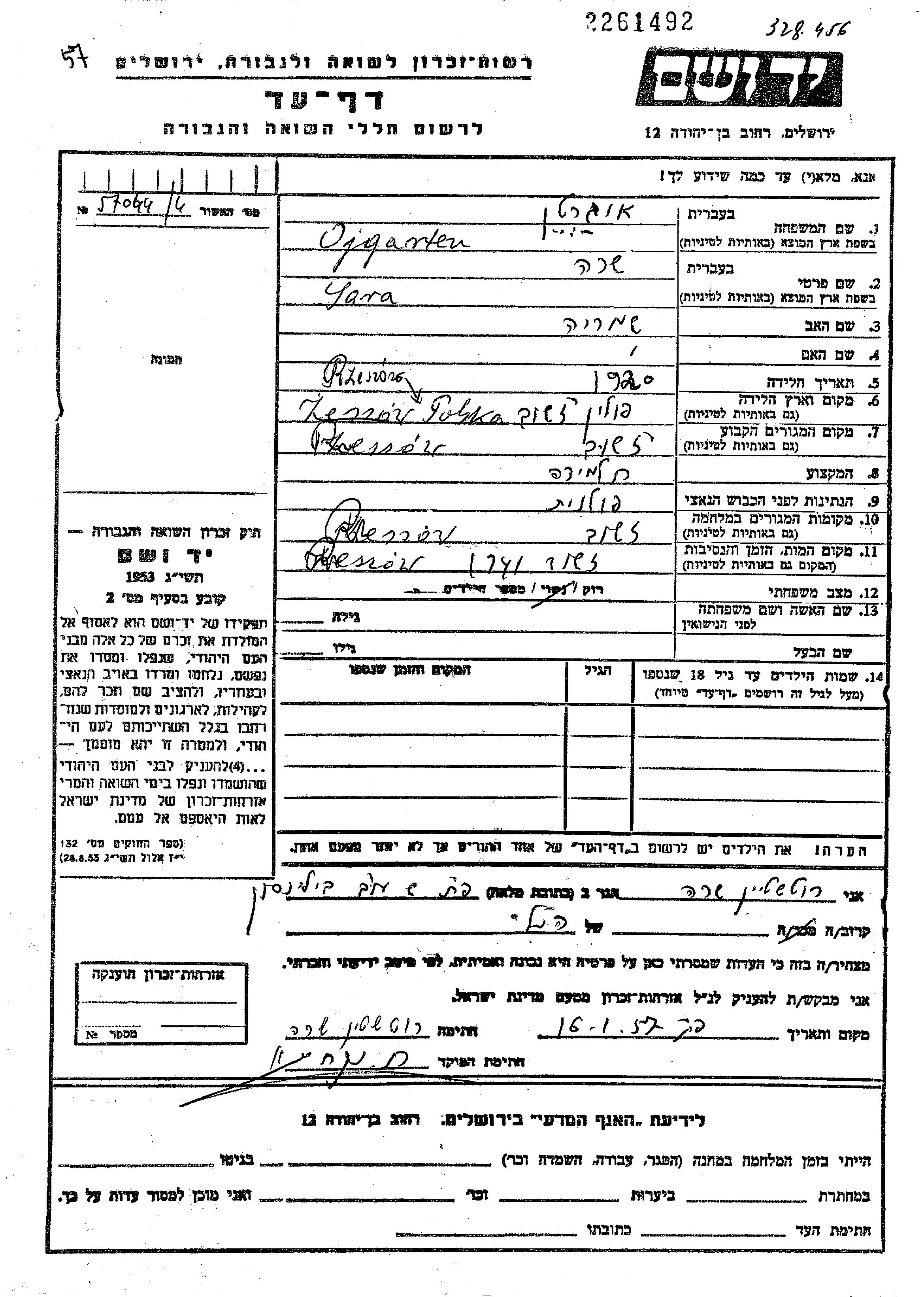 Ойгартен Сара 1920 Жешув, Польша Лист свидетельских показаний