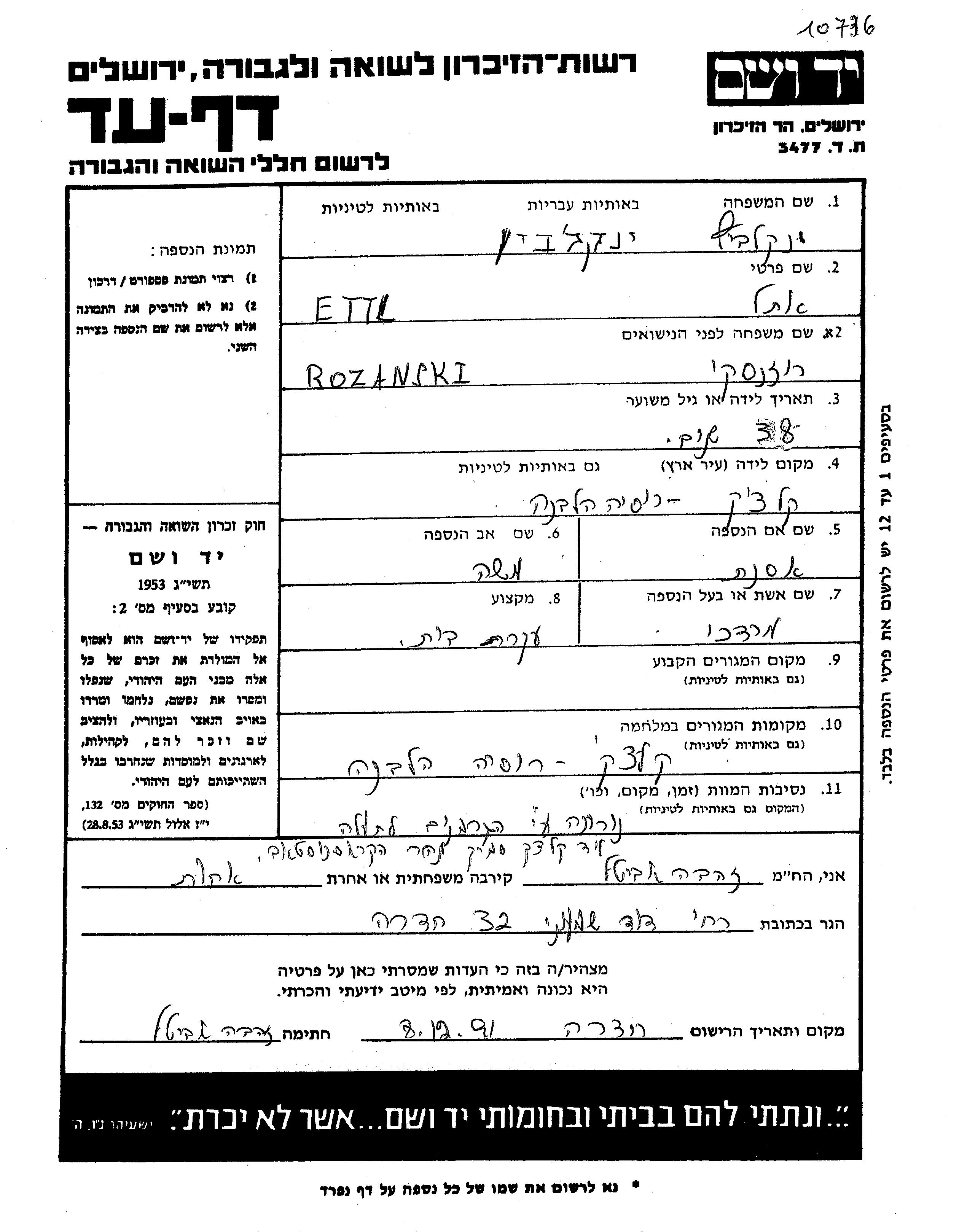 Этл Янкелевич, девичья фамилия Розански, место рождения: Клецк, Польша. Отец: Моше, mать:Аснат, девичья фамилия Шапиро. Домохозяйка. Женат / замужем. Место жительства до войны: Клецк, Польша. Место во время войны: Клецк, Польша.