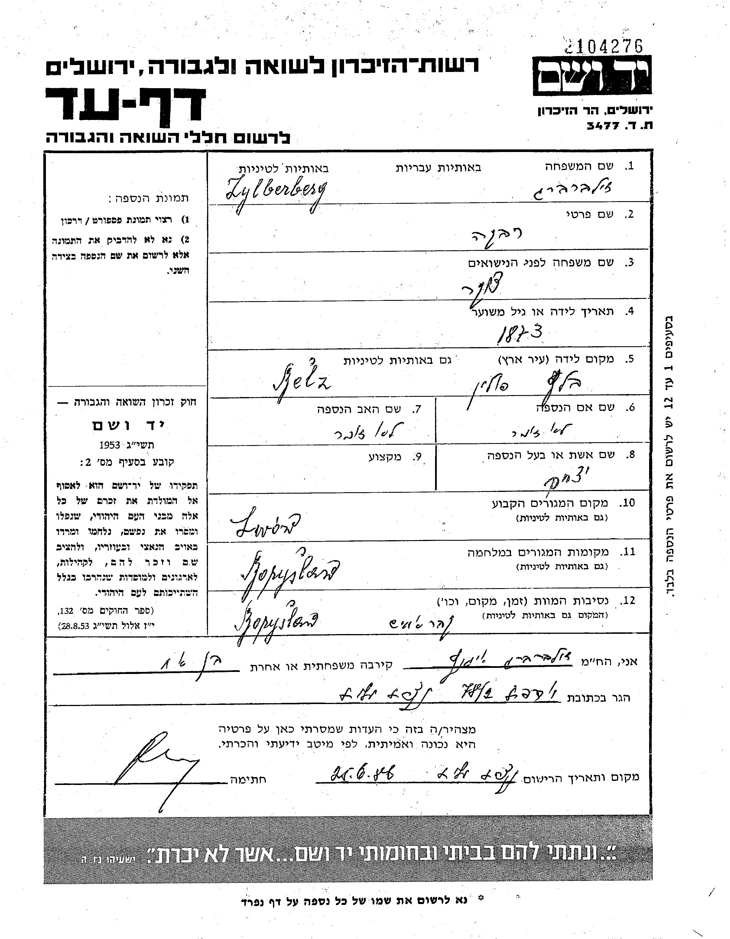 Зильберберг Ривка Львов, Польша Лист свидетельских показаний