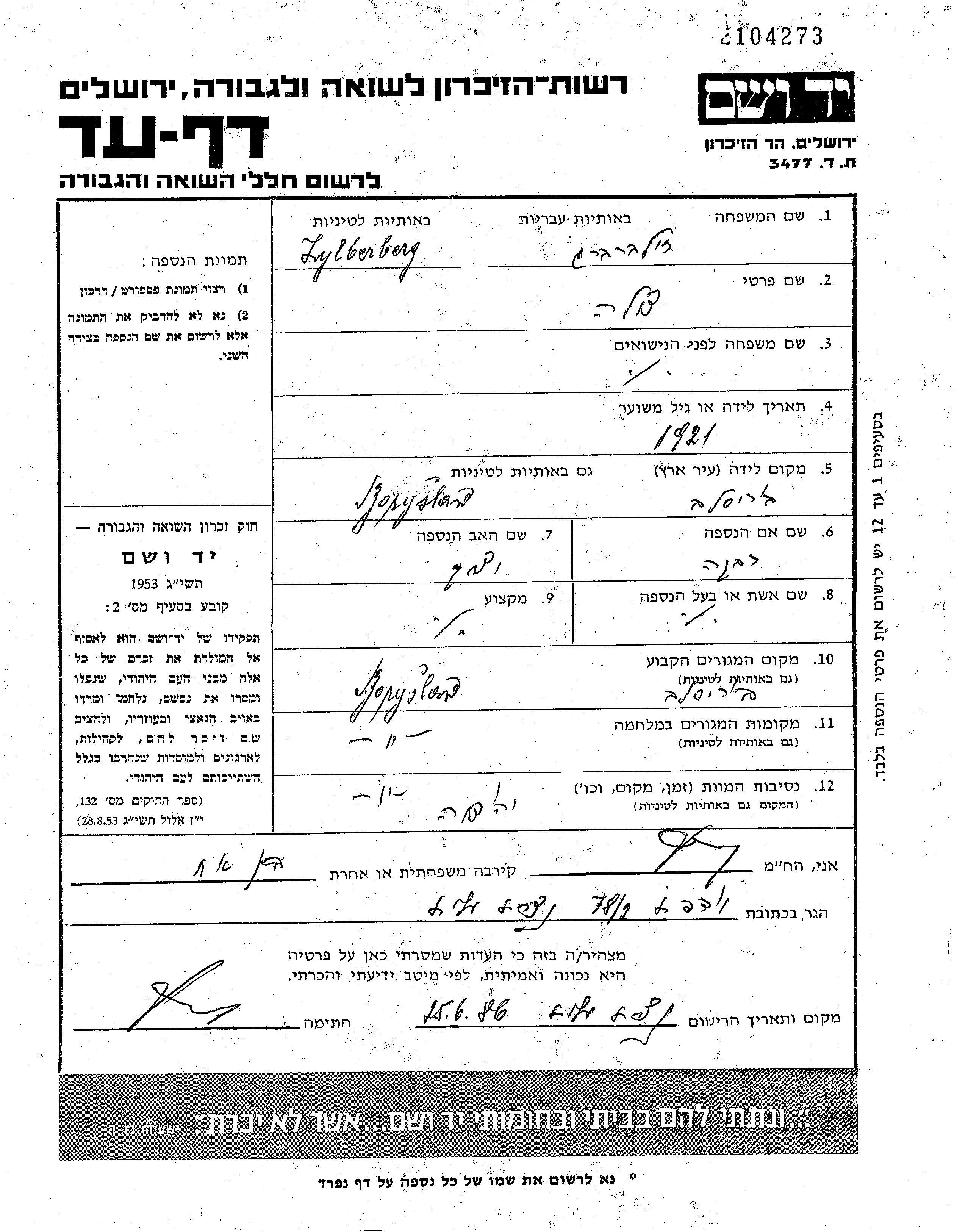 Яд Вашем - Листы свидетельских показаний Мемориального фонда