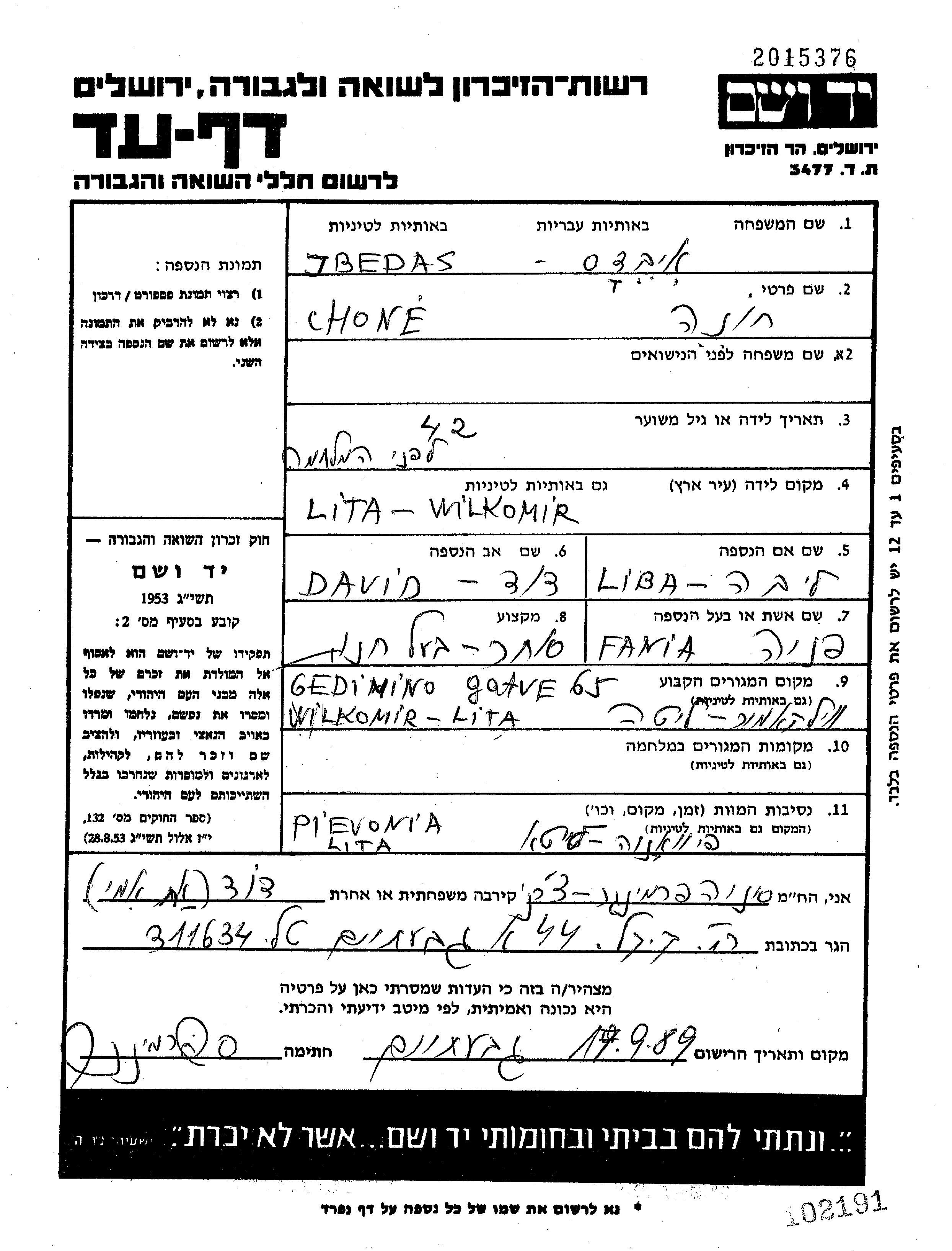 Хоне Ибедас, место рождения: Вилкомир, Литва. Отец: Давид, mать:Либа. Владелец / владелица магазина. Женат / замужем. Место жительства до войны: Вилкомир, Литва.