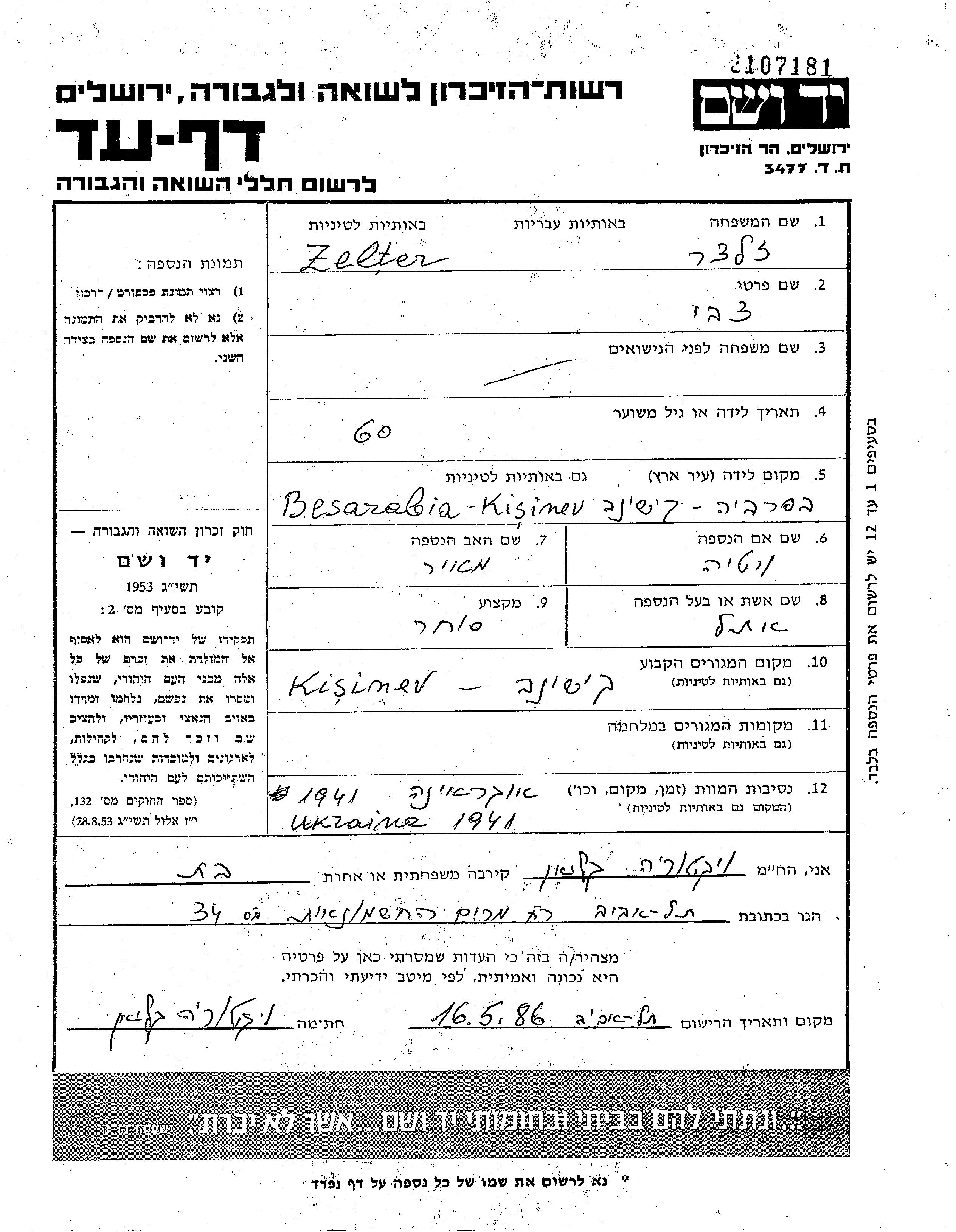 Зельтер Зельцер Цви Кишинёв, Румыния Лист свидетельских показаний