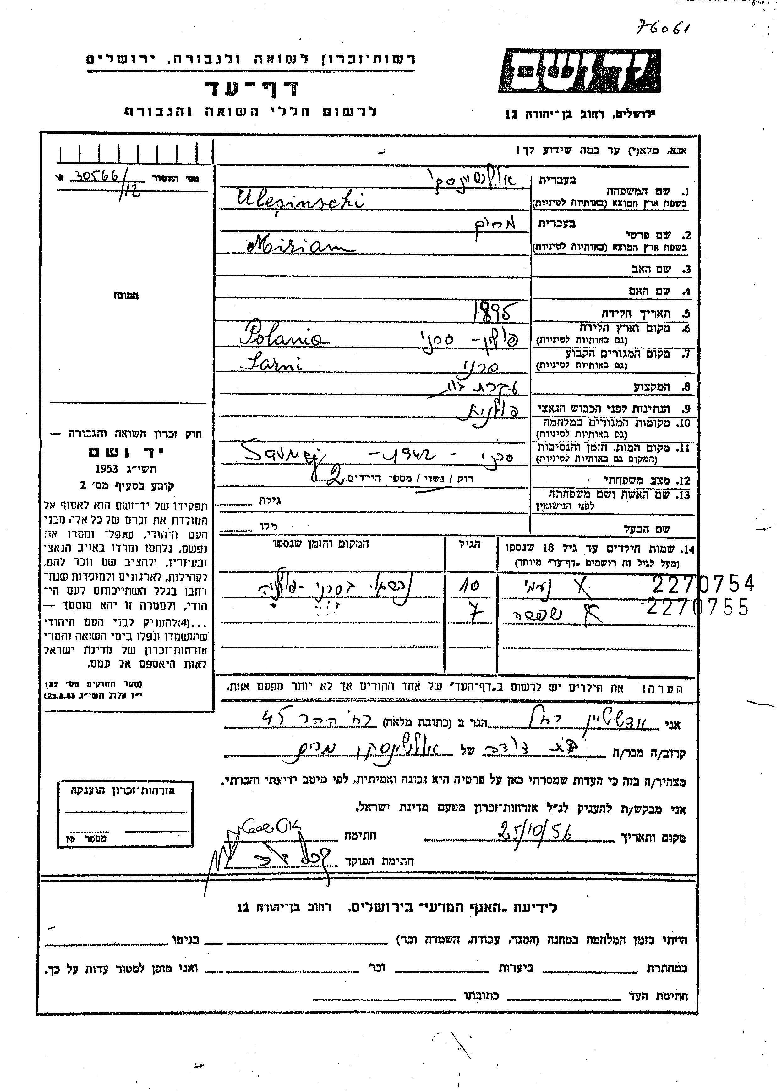 Яд Вашем - Листы свидетельских показаний Мемориального фонда
