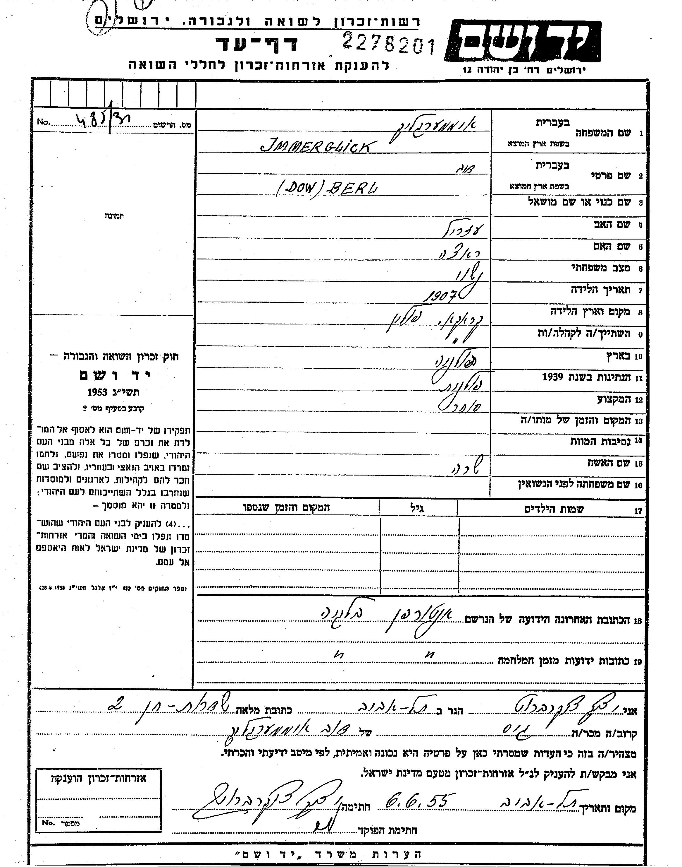 Дов Берл Иммерглик, место рождения: Краков, Польша. Отец: Азриэль, mать:Рода Рада. Торговец / торговка. Женат / замужем. Место жительства до войны: Антверпен, Бельгия. Место во время войны: Антверпен, Бельгия.