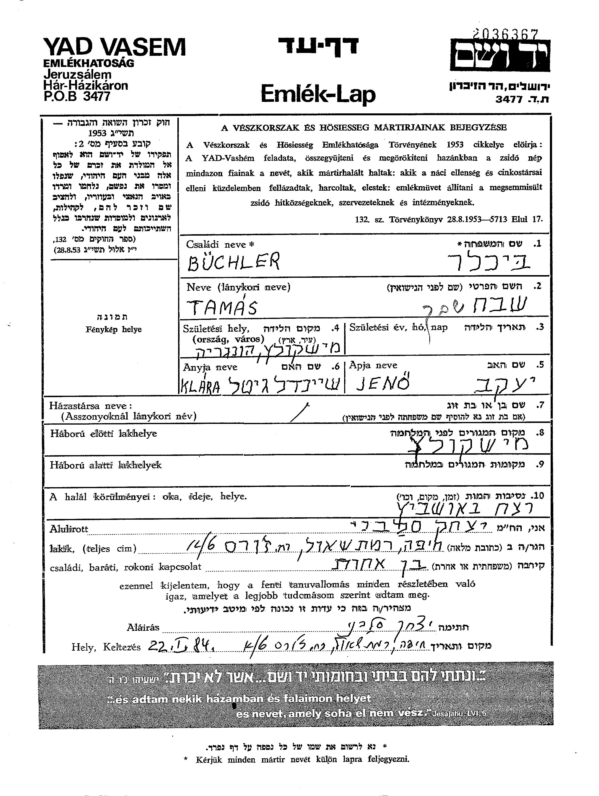 Тамас Шевах Бухлер Бихлер, место рождения: Мишкольц, Венгрия. Отец: Ено Яков, mать:Клара Шейндель. Ребенок. Место жительства до войны: Мишкольц, Венгрия. Место во время войны: Мишкольц, Венгрия.