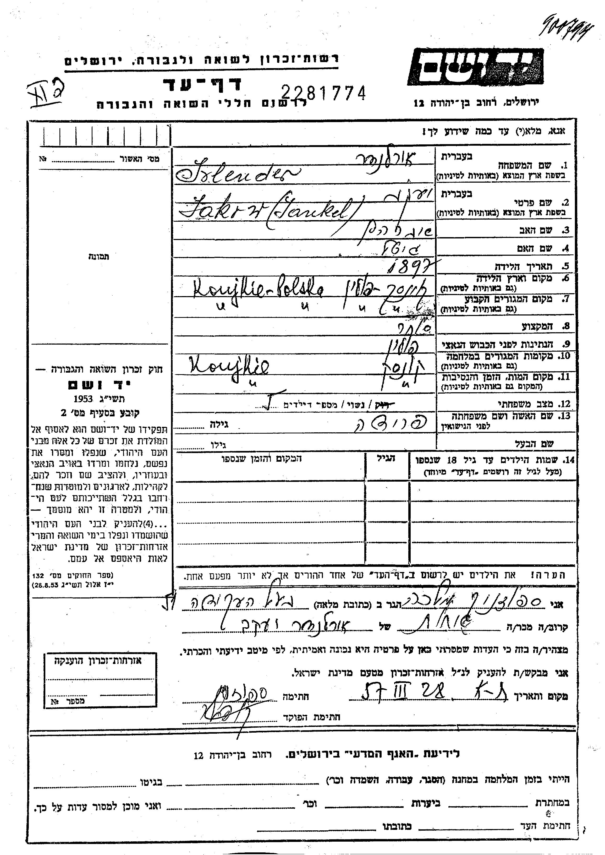 Яков Ирлендер, место рождения: Коньске, Польша. Отец: Авраам, mать:Гитл. Торговец / торговка. Женат / замужем. Место жительства до войны: Коньске, Польша. Место во время войны: Коньске, Польша.