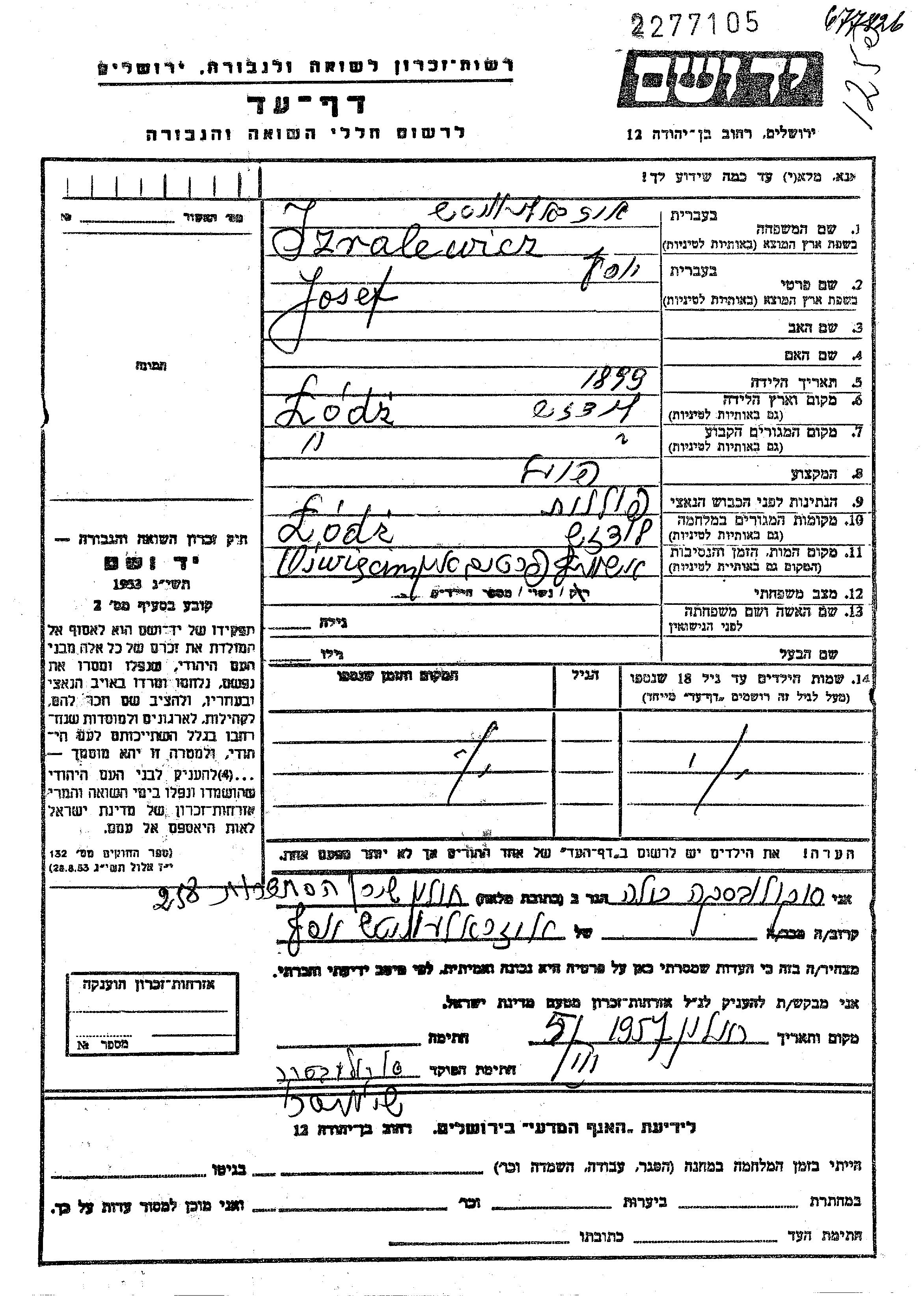 Изралевич Йосеф 1899 Лодзь, Польша Лист свидетельских показаний