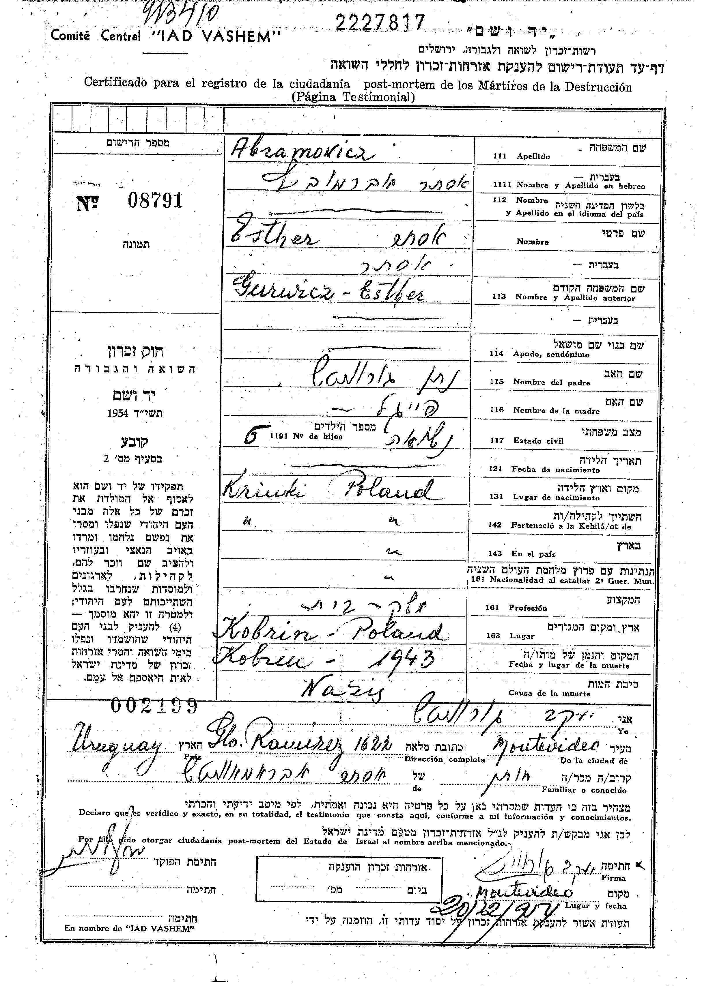 Эстер Абрамович, девичья фамилия Гурвич, место рождения: Крынки, Польша. Отец: Натан, mать:Файгель. Домохозяйка. Женат / замужем. Место жительства до войны: Крынки, Польша. Место во время войны: Кобрынь, Польша.