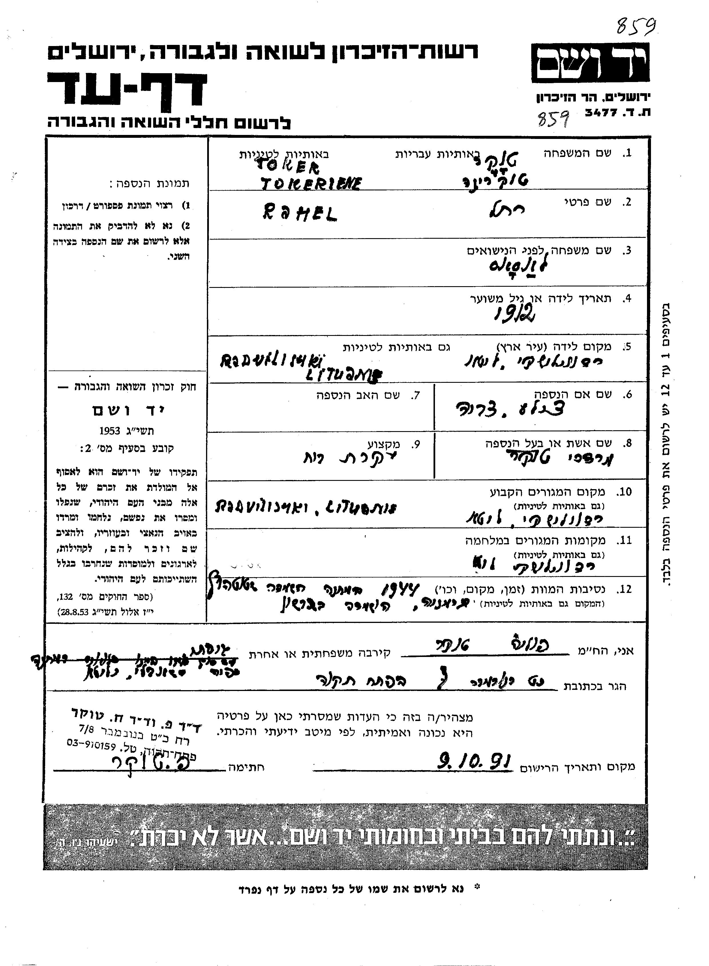 Токер Рахель 1912 Радвилишкис, Литва Лист свидетельских показаний
