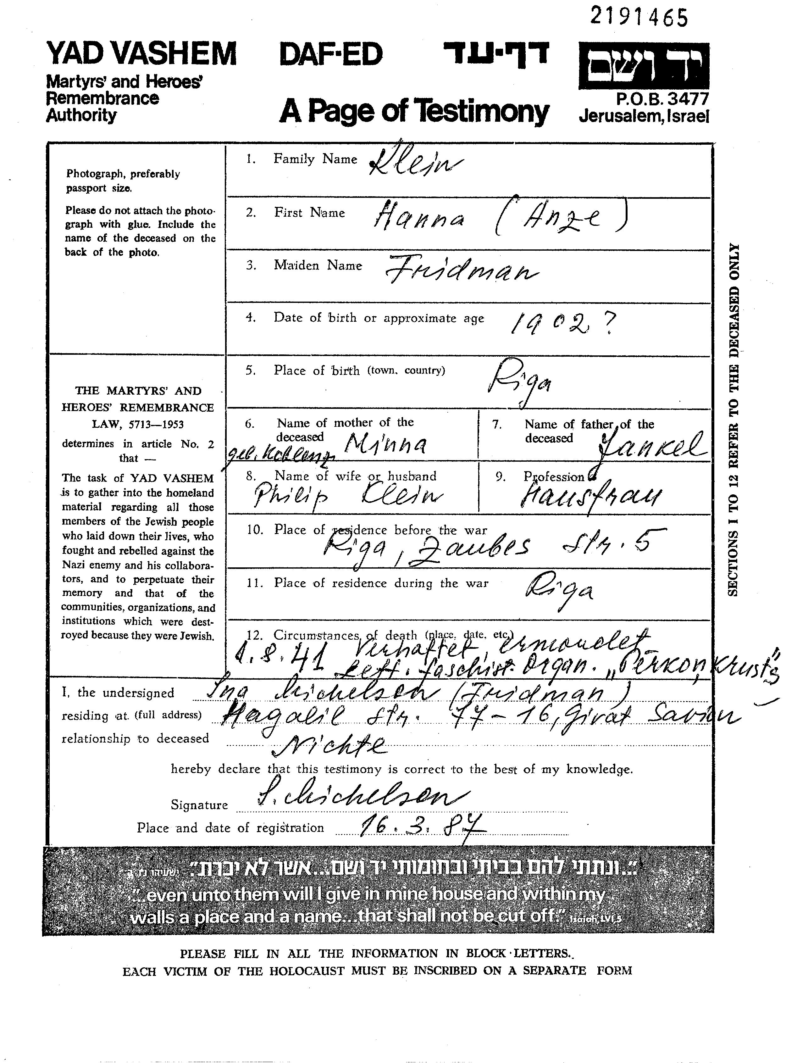 Клейн Ханна Анжел Энзел 1902 Рига, Латвия Лист свидетельских показаний
