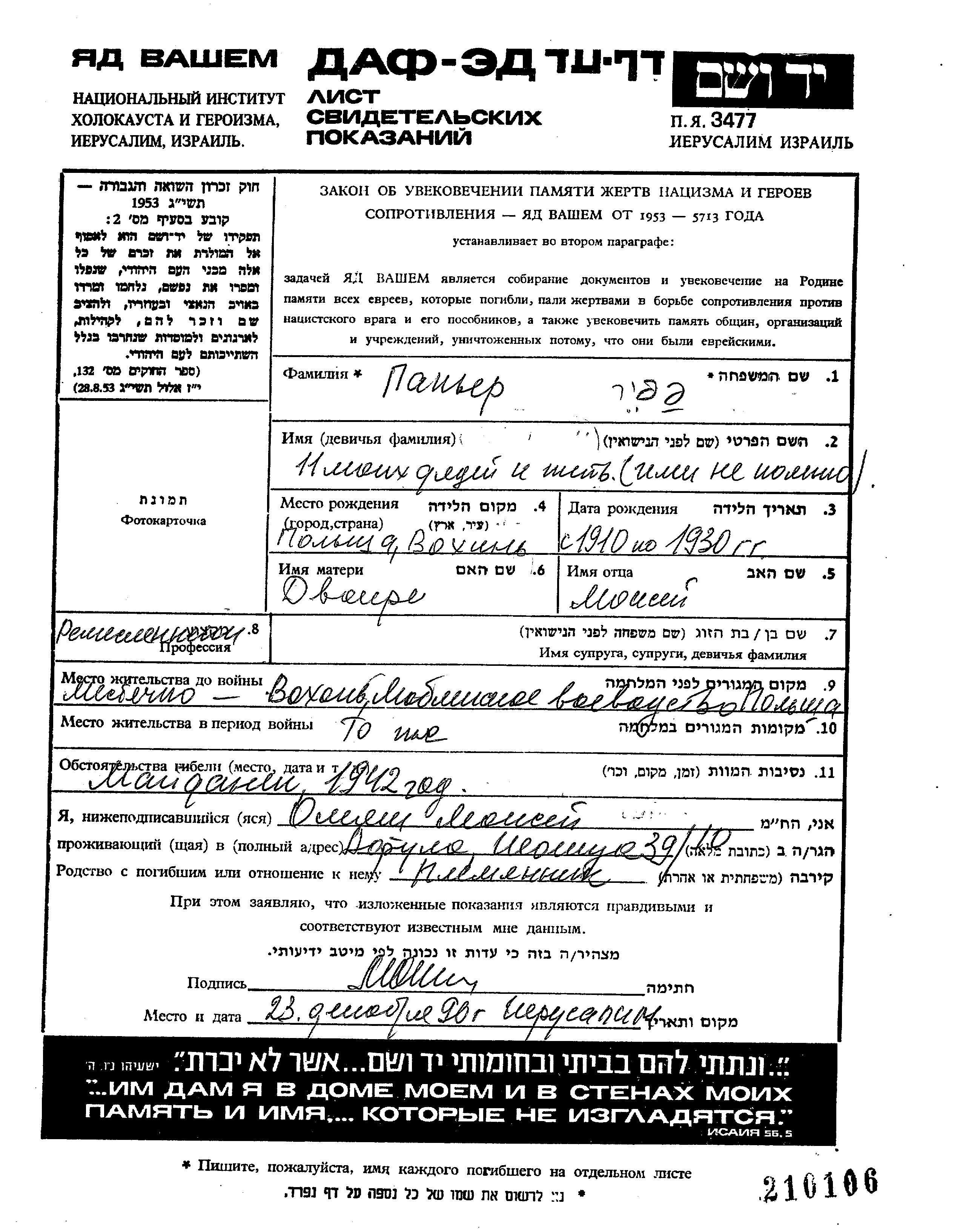 Имя неизвестно Папер, место рождения: Вохынь, Польша. Отец: Моисей, mать:Двойре. Ремесленник / кустарь. Место жительства до войны: Вохынь, Польша. Место во время войны: Вохынь, Польша.