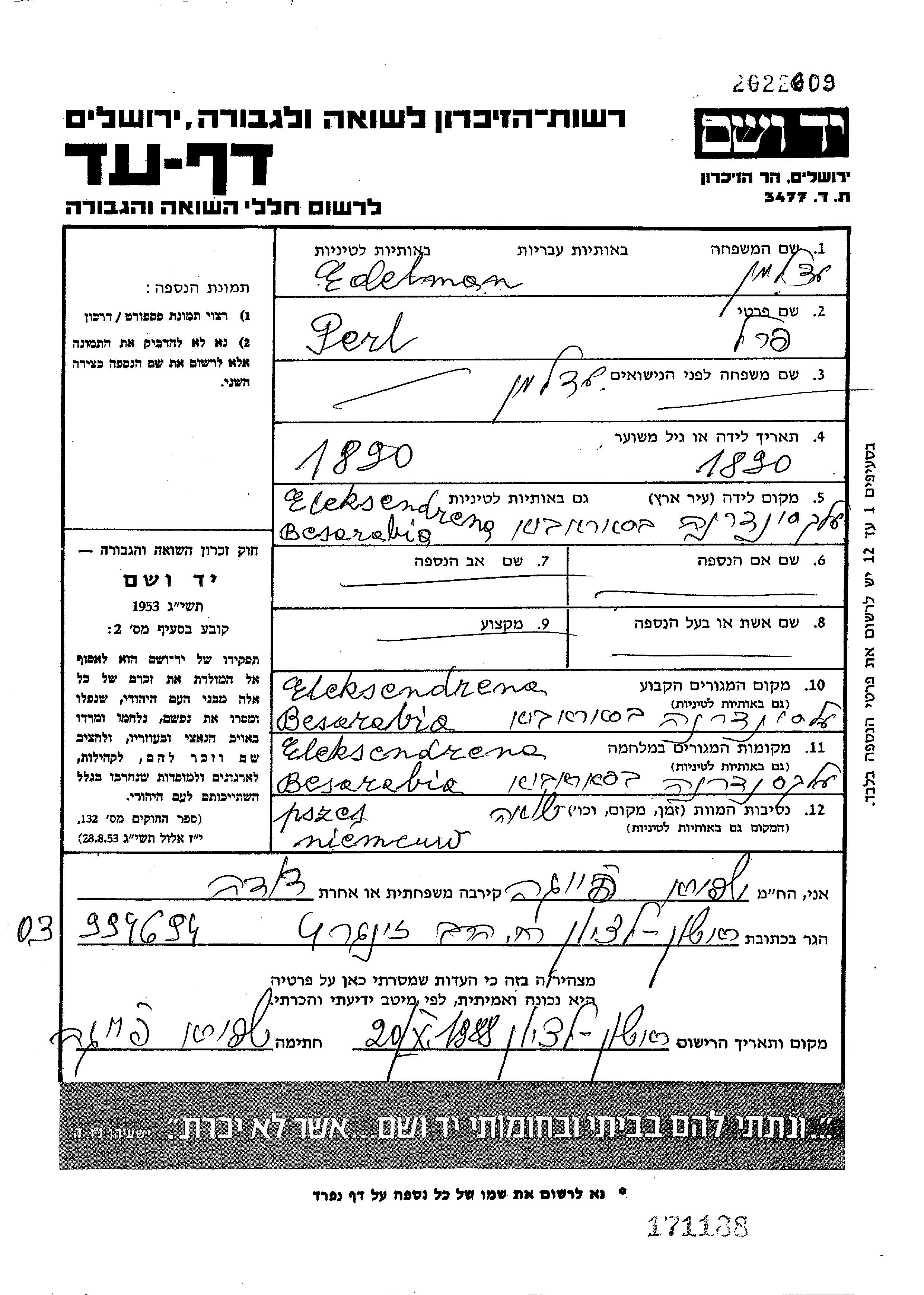 Перл Эдельман, место рождения: Александрень, Румыния. Место жительства до войны: Александрень, Румыния. Место во время войны: Александрень, Румыния.