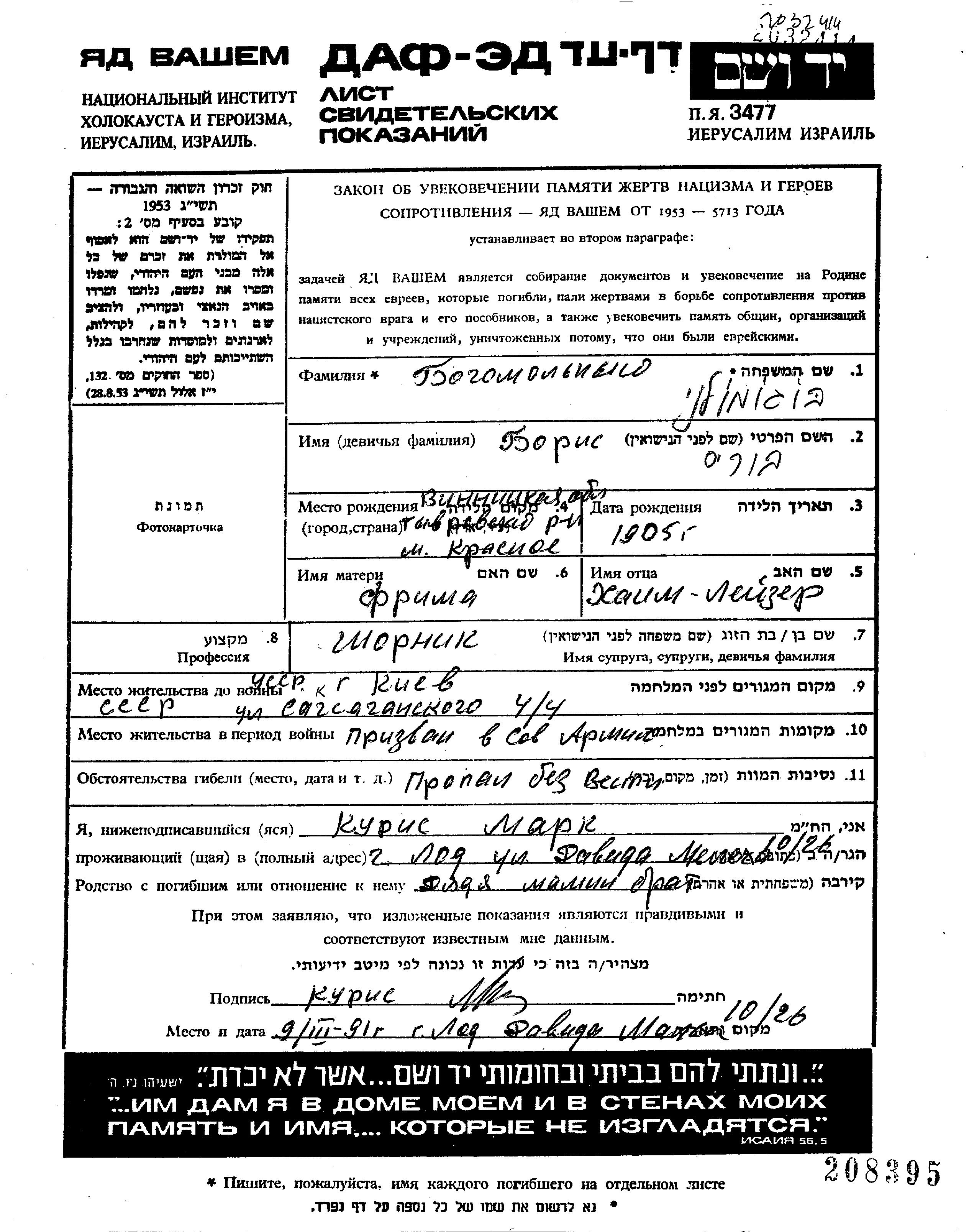 Богомольный Борис 1905 Киев, Украина (СССР) Лист свидетельских показаний