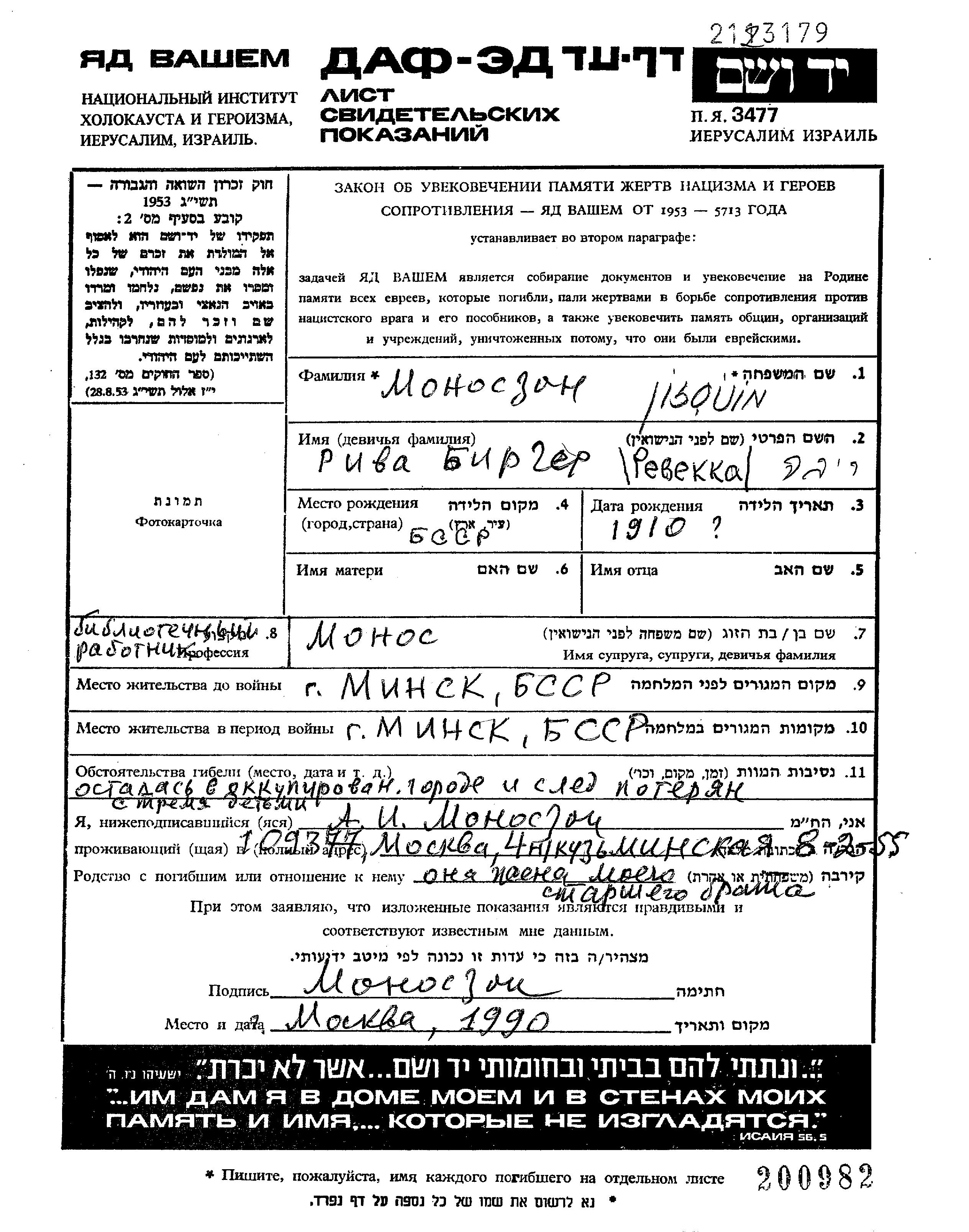 Рива Моносзон, девичья фамилия Биргер, место рождения: Белоруссия (СССР). Библиотекарь. Женат / замужем. Место жительства до войны: Минск, Белоруссия (СССР). Место во время войны: Минск, Белоруссия (СССР). Рива уничтоженa в период Шоа.
