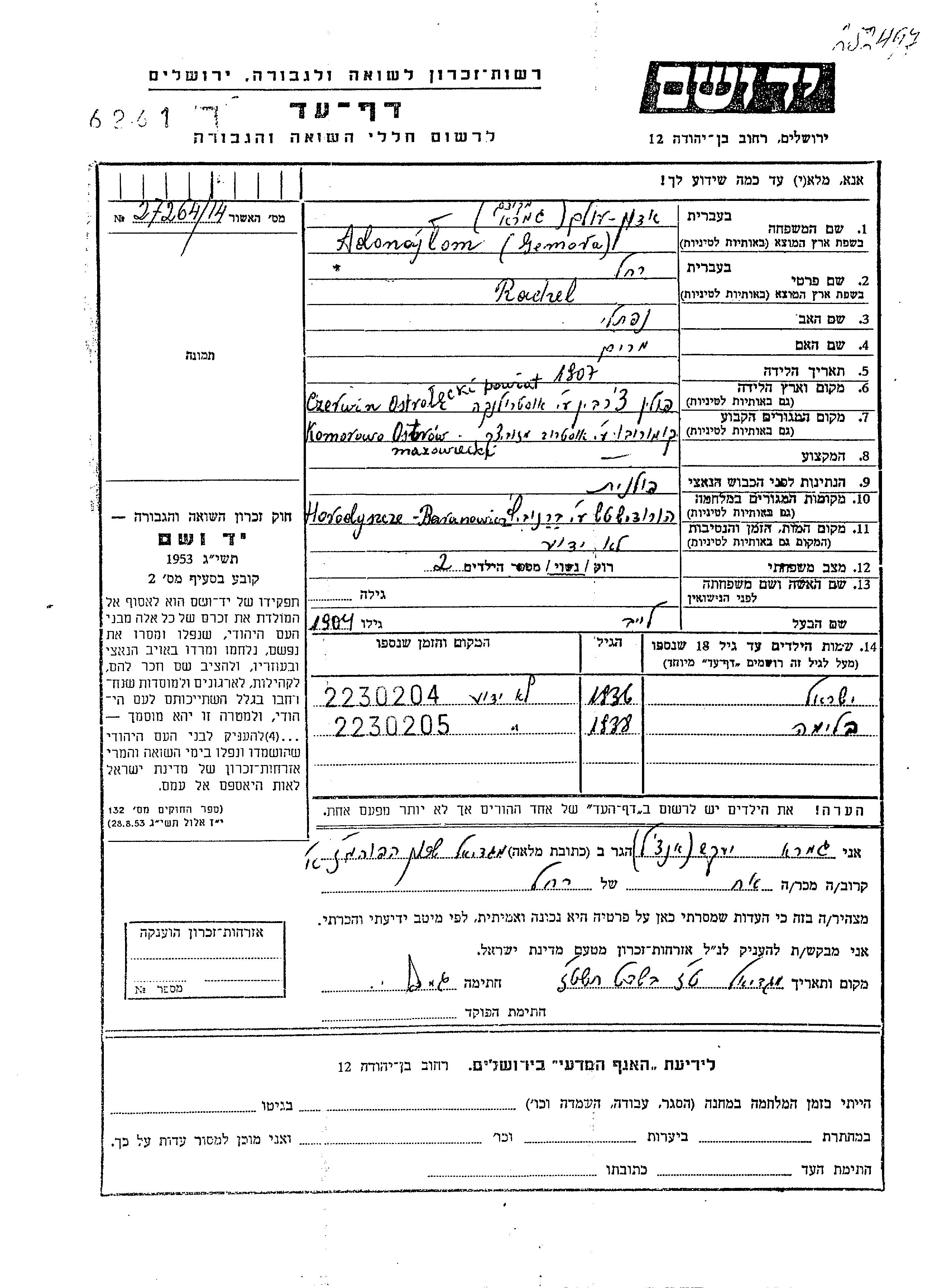 Адонайлом Исраэль 1936 Коморово, Польша Лист свидетельских показаний