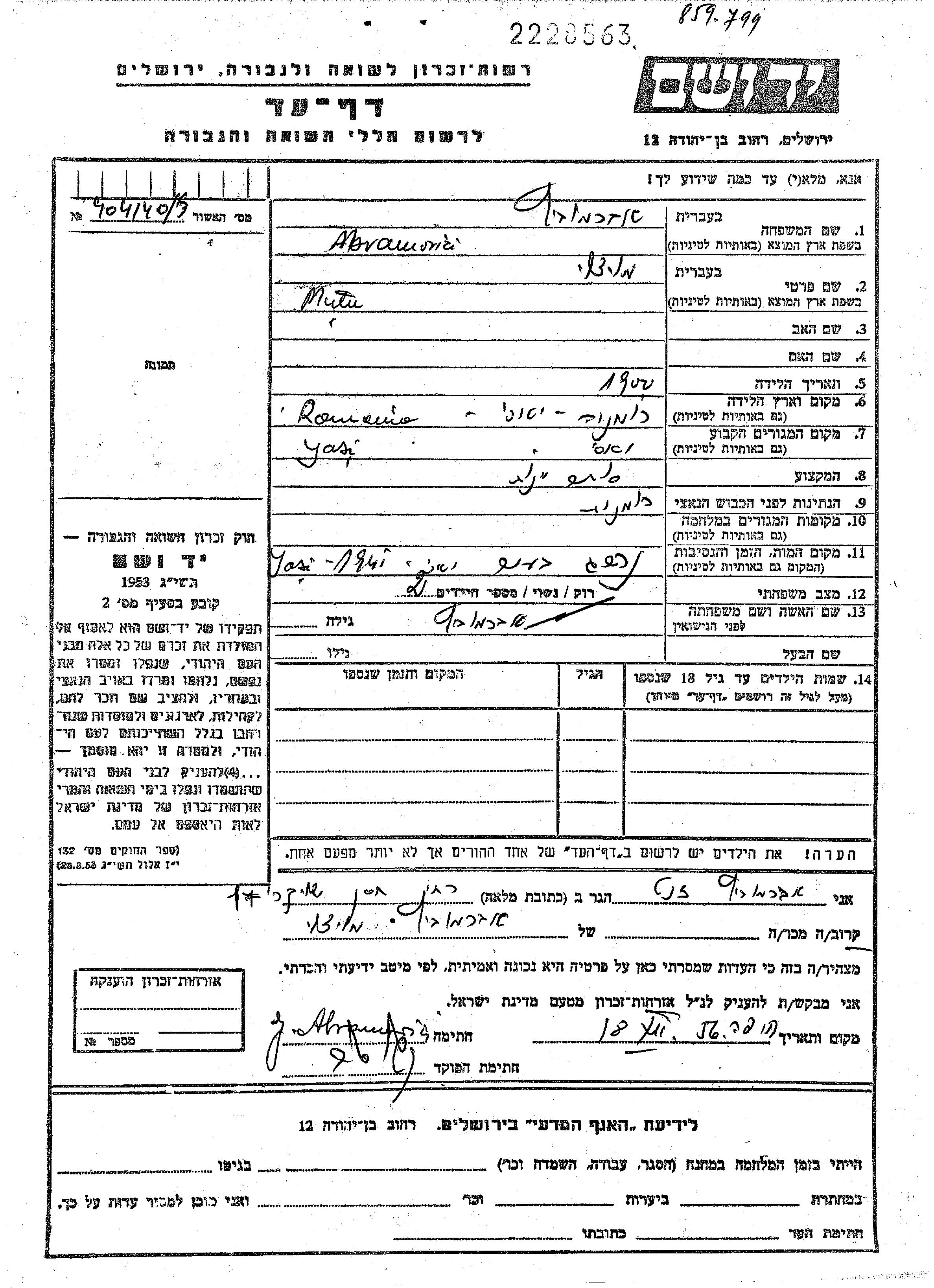 Абрамовиц Муцу Муцо 1900 Яссы, Румыния Лист свидетельских показаний