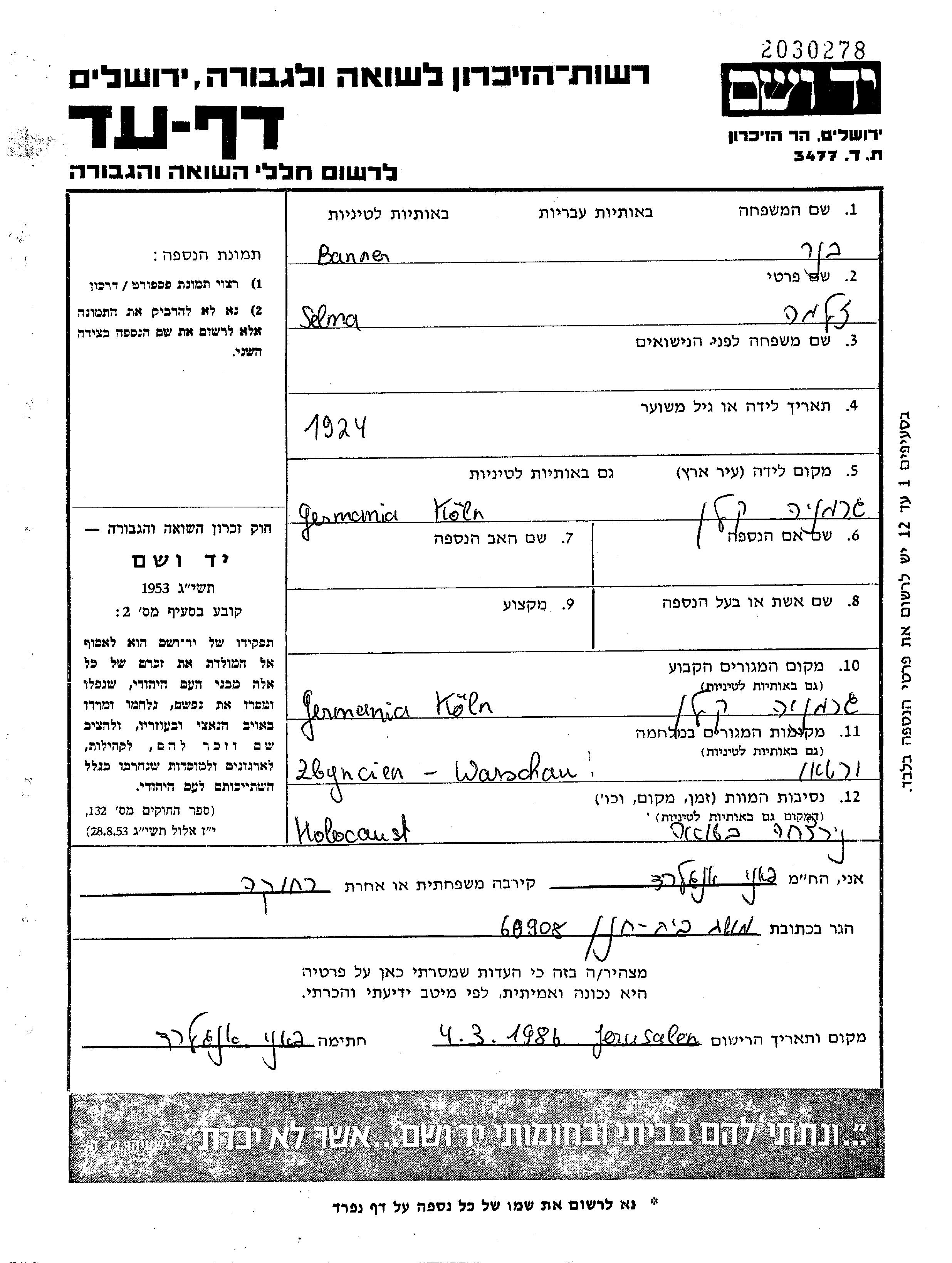 Сельма Баннер, место рождения: Кёльн, Германия. Ребенок. Место жительства до войны: Кёльн, Германия. Место во время войны: Варшава, Польша.