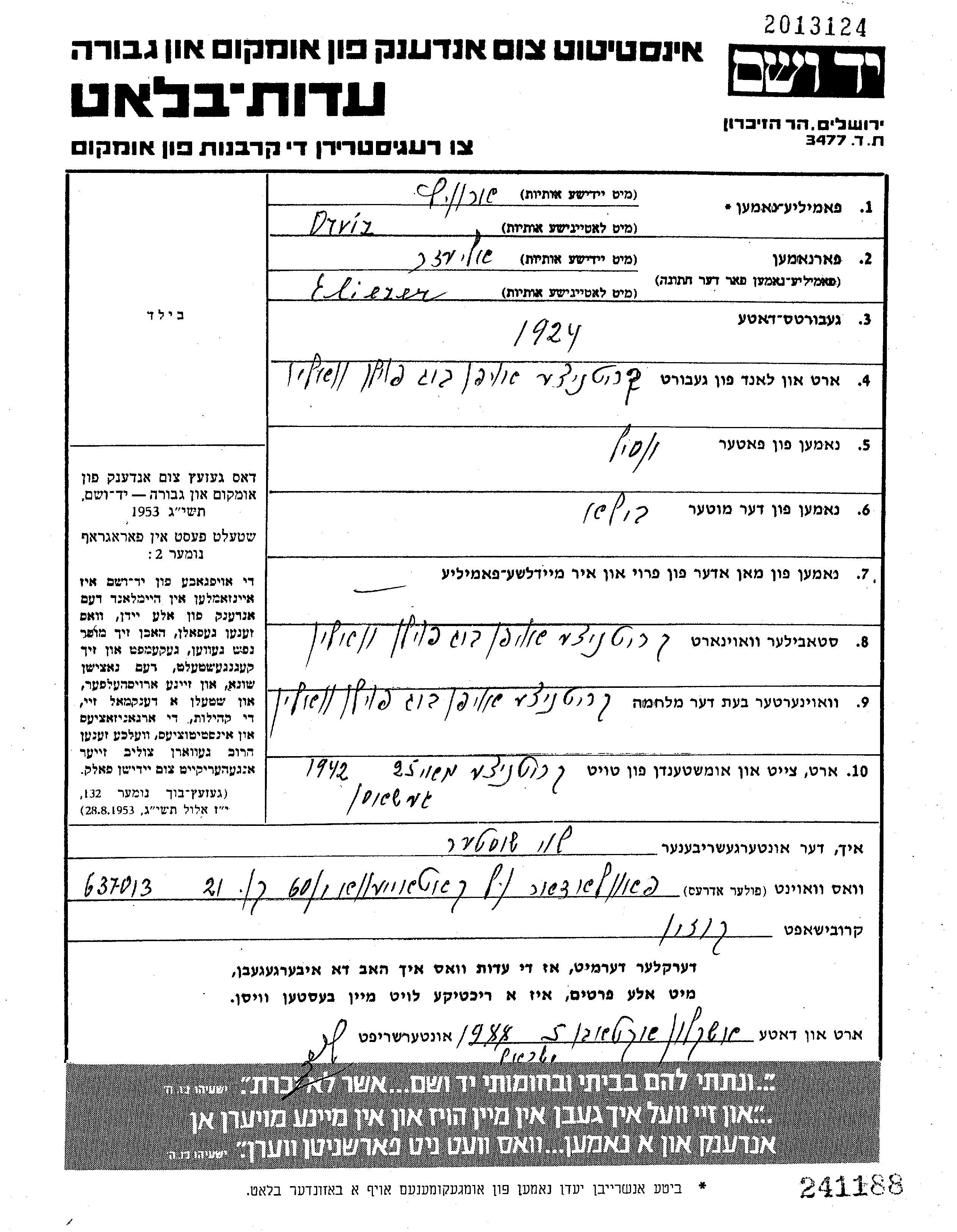 Орвиц Уревич Элиэзер 1924 Корытница, Польша Лист свидетельских показаний