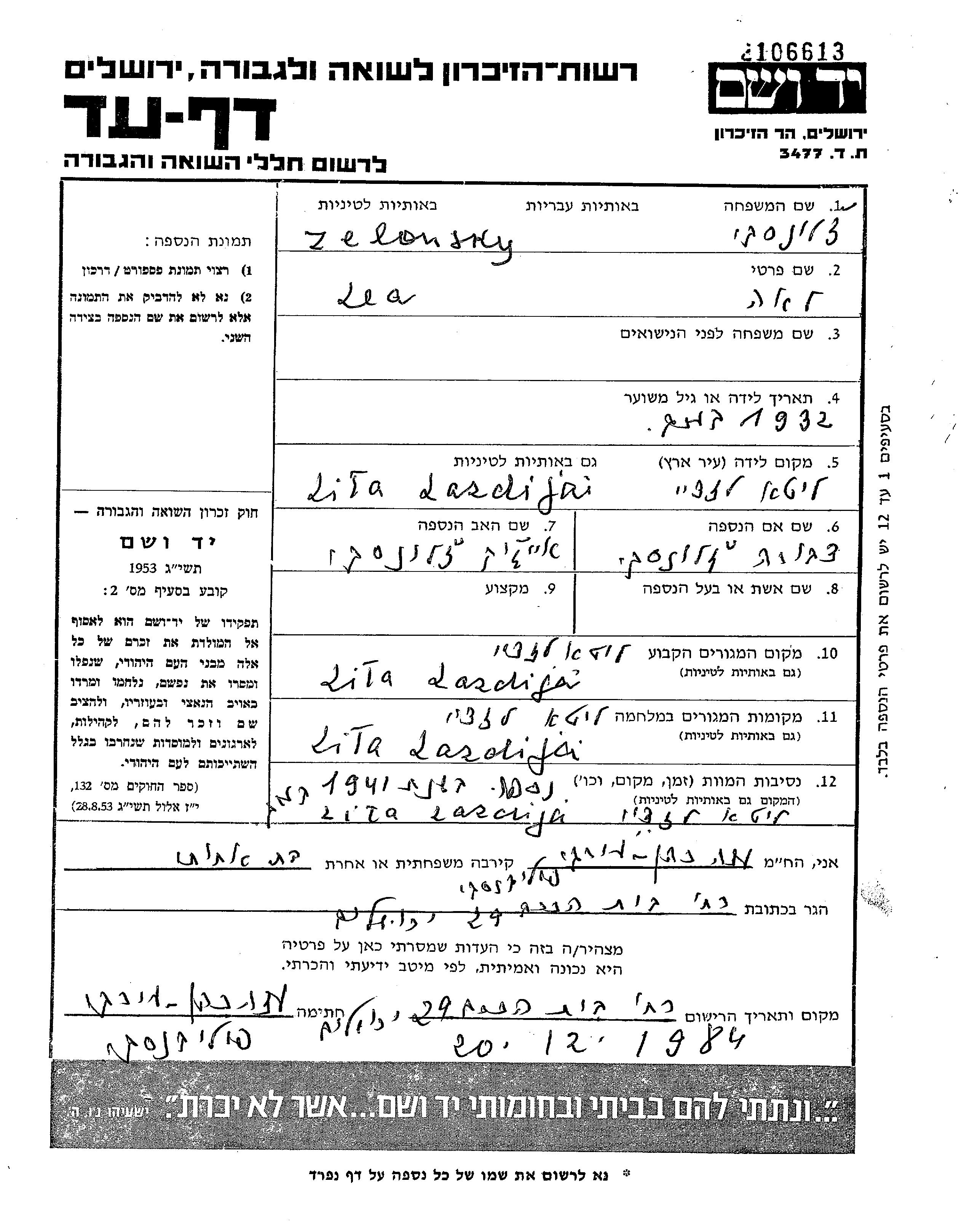 Лея Зелонски, место рождения: Лаздияй, Литва. Отец: Айзик, mать:Двора, девичья фамилия Поливански. Ребенок. Место жительства до войны: Лаздияй, Литва. Место во время войны: Лаздияй, Литва.