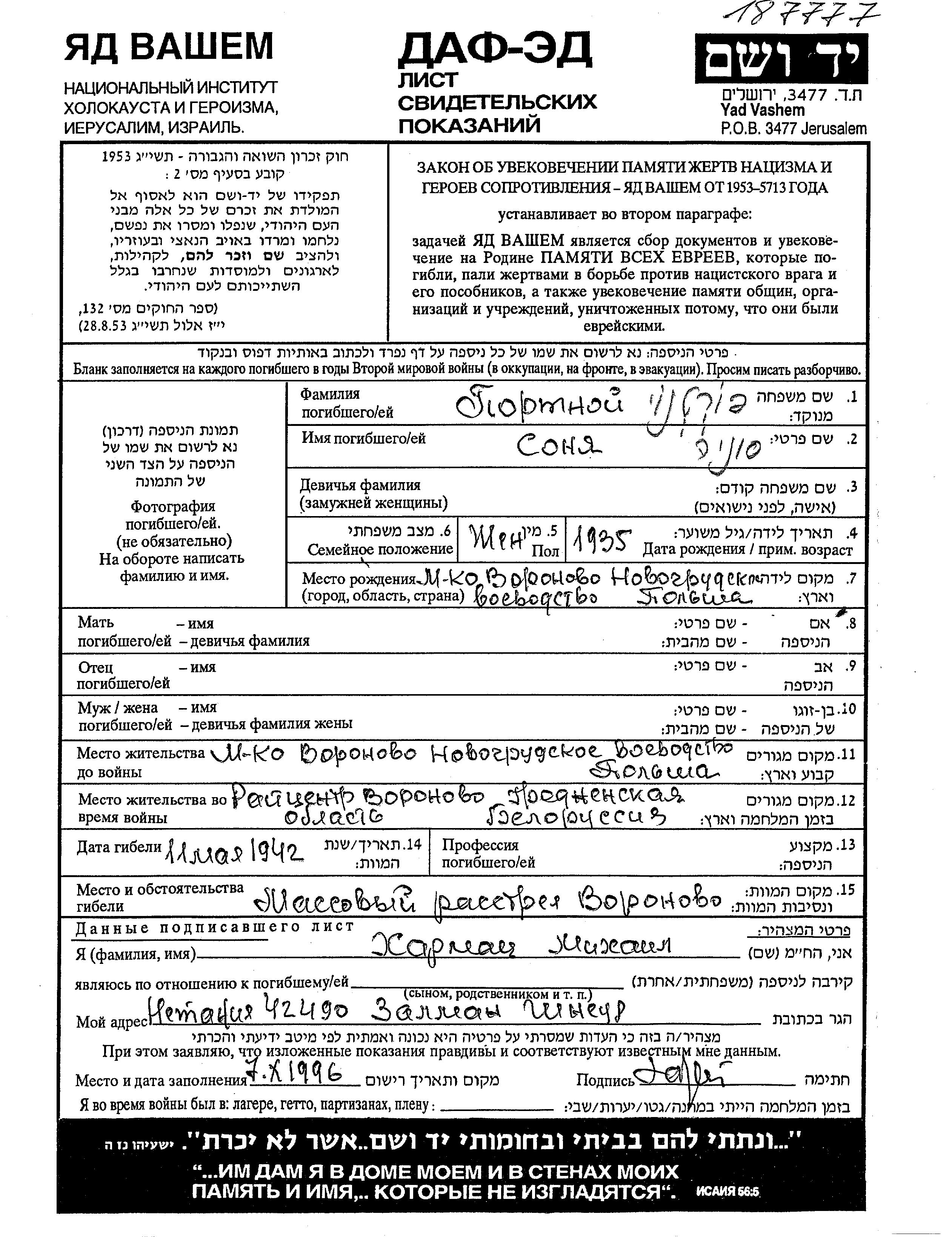 Яд Вашем - Листы свидетельских показаний Мемориального фонда