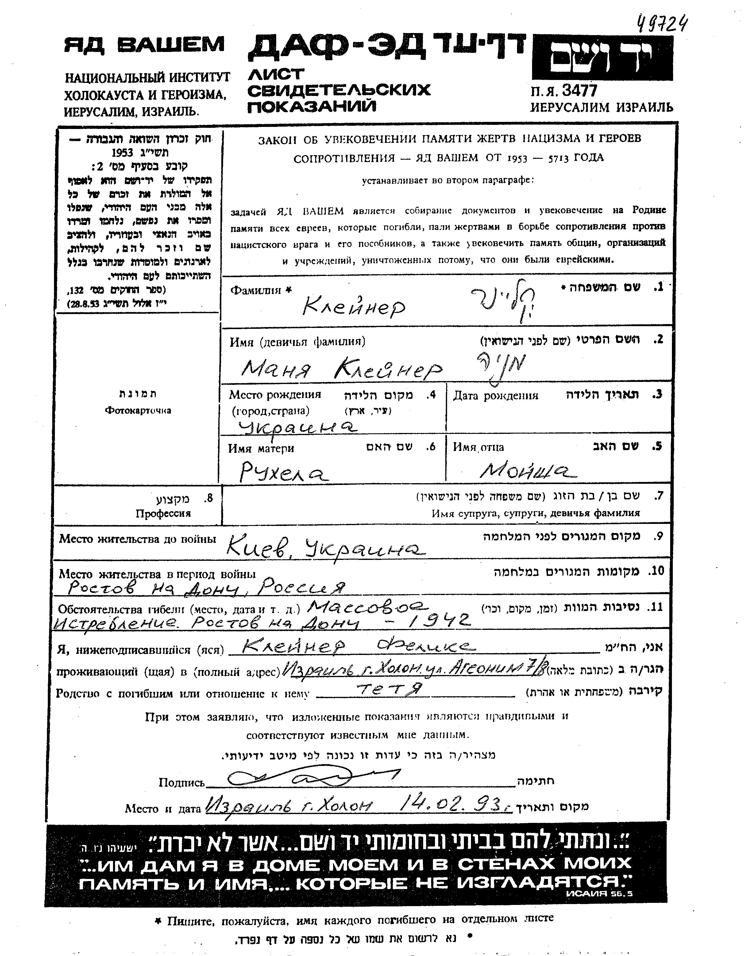 Маня Клейнер, место рождения: Украина (СССР). Отец: Мойша, mать:Рахель. Место жительства до войны: Киев, Украина (СССР). Место во время войны: Ростов, Россия (СССР).