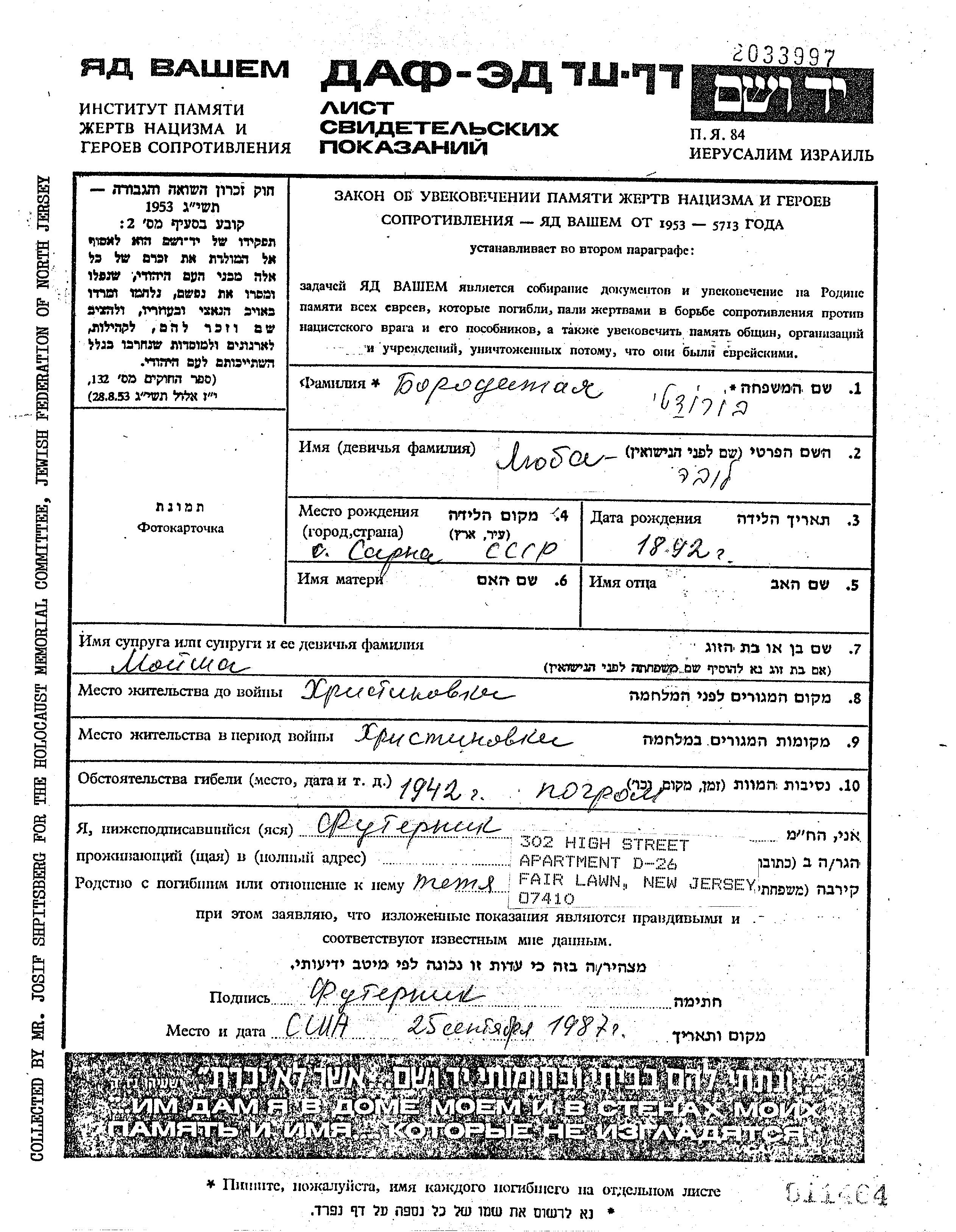 Бородатый Любовь 1892 Христиновка, Украина (СССР) Лист свидетельских показаний