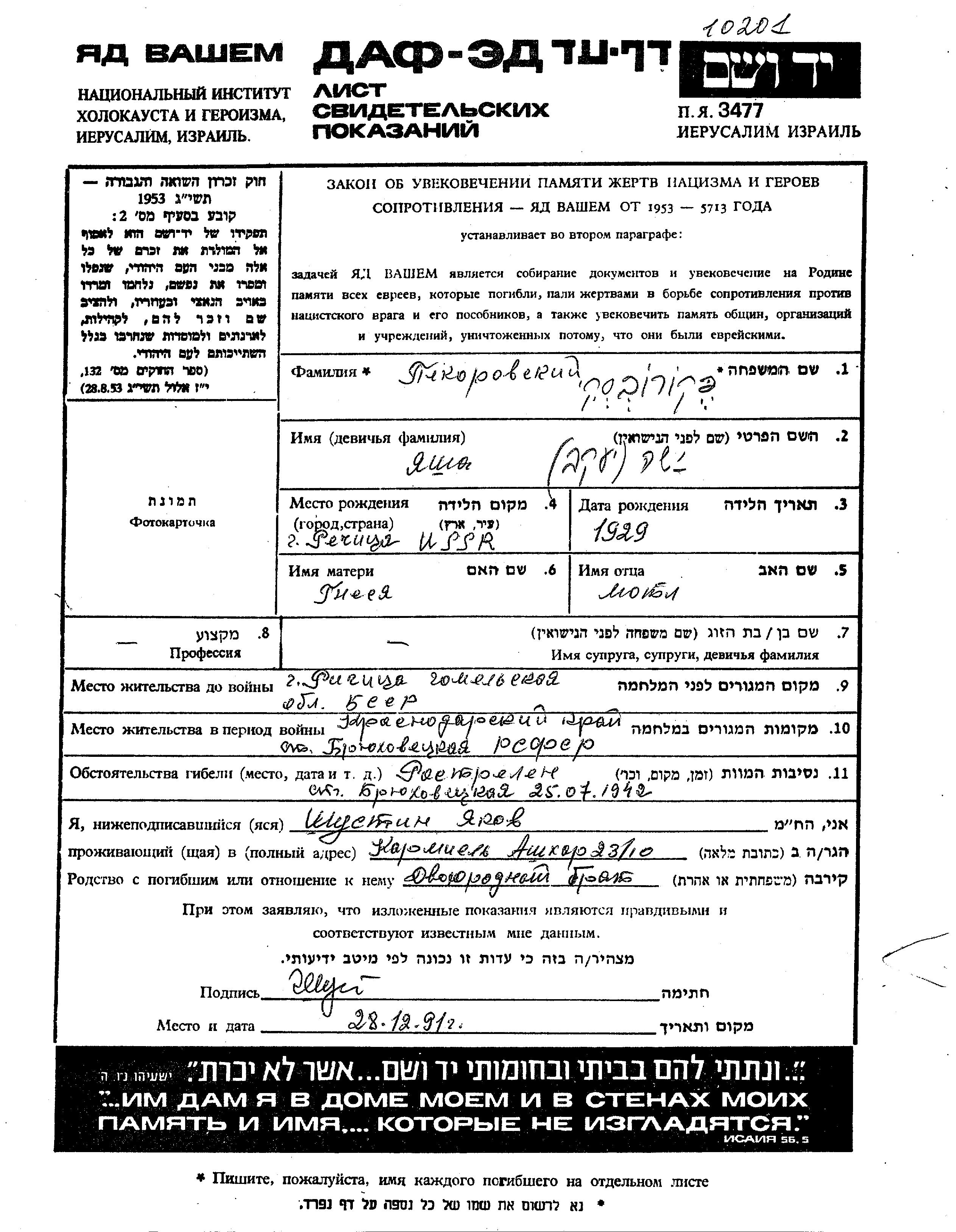 Пекоровский Яша 1929 Речица, Белоруссия (СССР) Лист свидетельских показаний