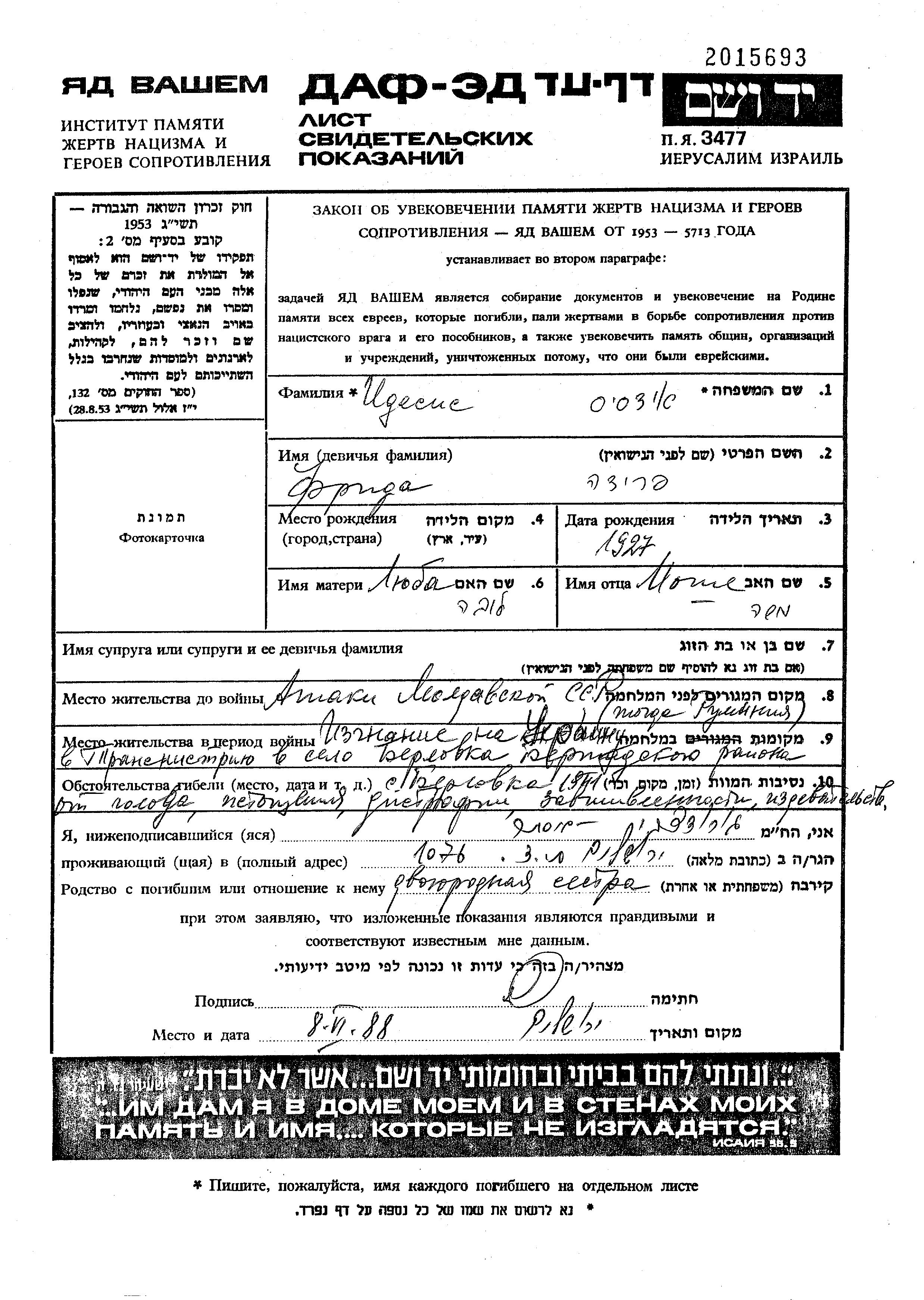Яд Вашем - Листы свидетельских показаний Мемориального фонда