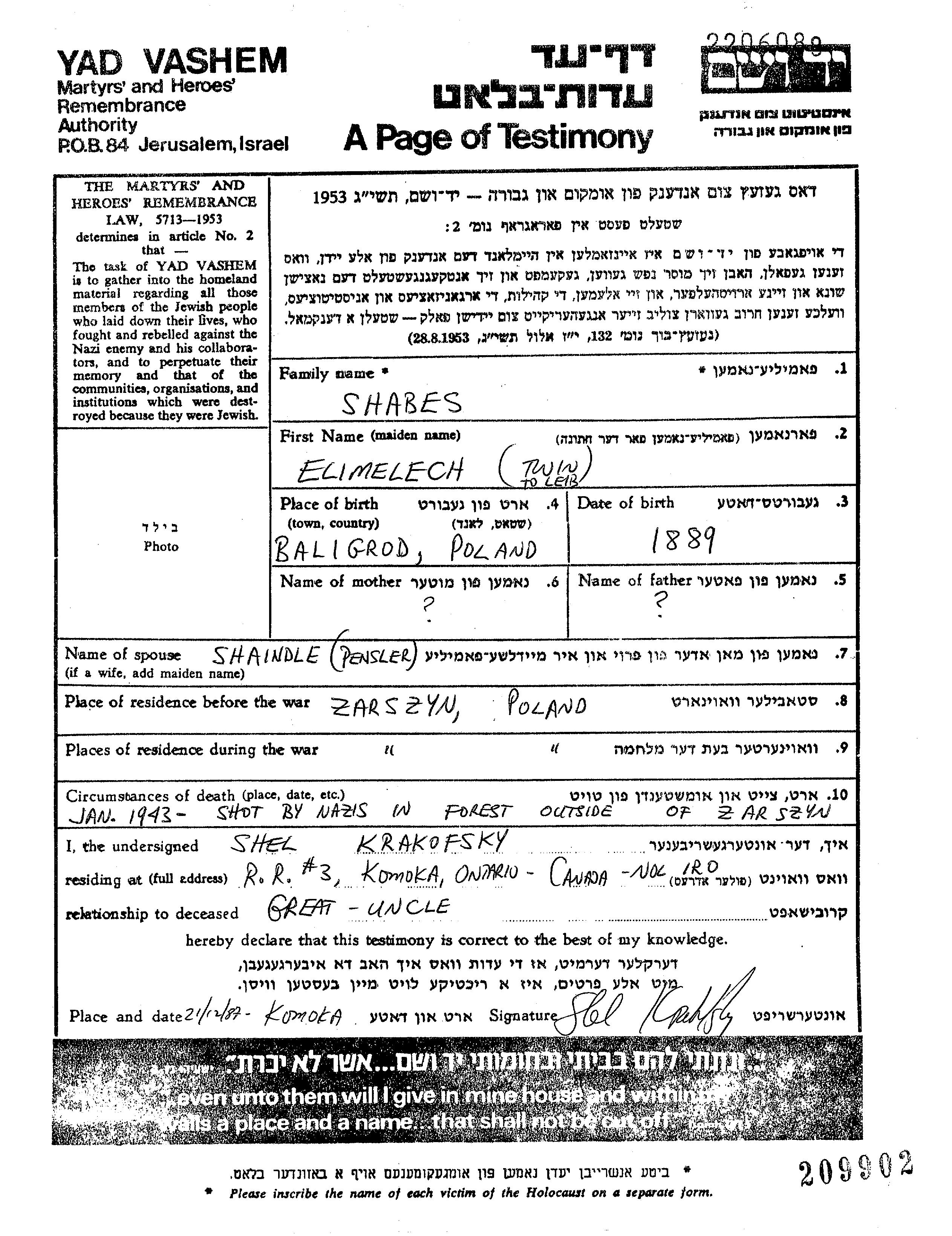 Элимелех Шабес Шевес, место рождения: Балигруд, Польша. Женат / замужем. Место жительства до войны: Заршин, Польша. Место во время войны: Заршин, Польша.