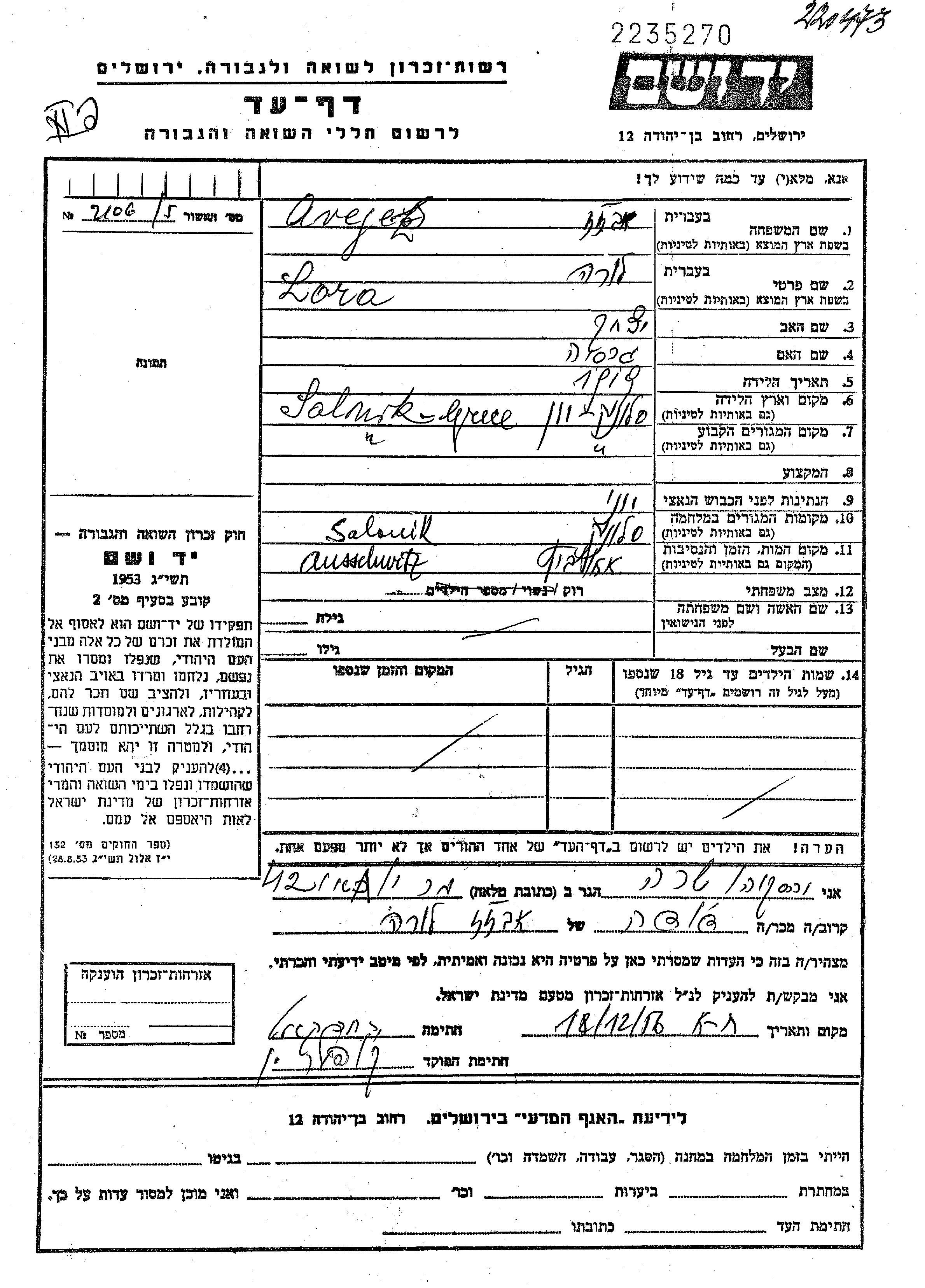 Лора Авежес, место рождения: Салоники, Греция. Отец: Ицхак, mать:Грасия. Холост / не замужем. Место жительства до войны: Салоники, Греция. Место во время войны: Салоники, Греция.
