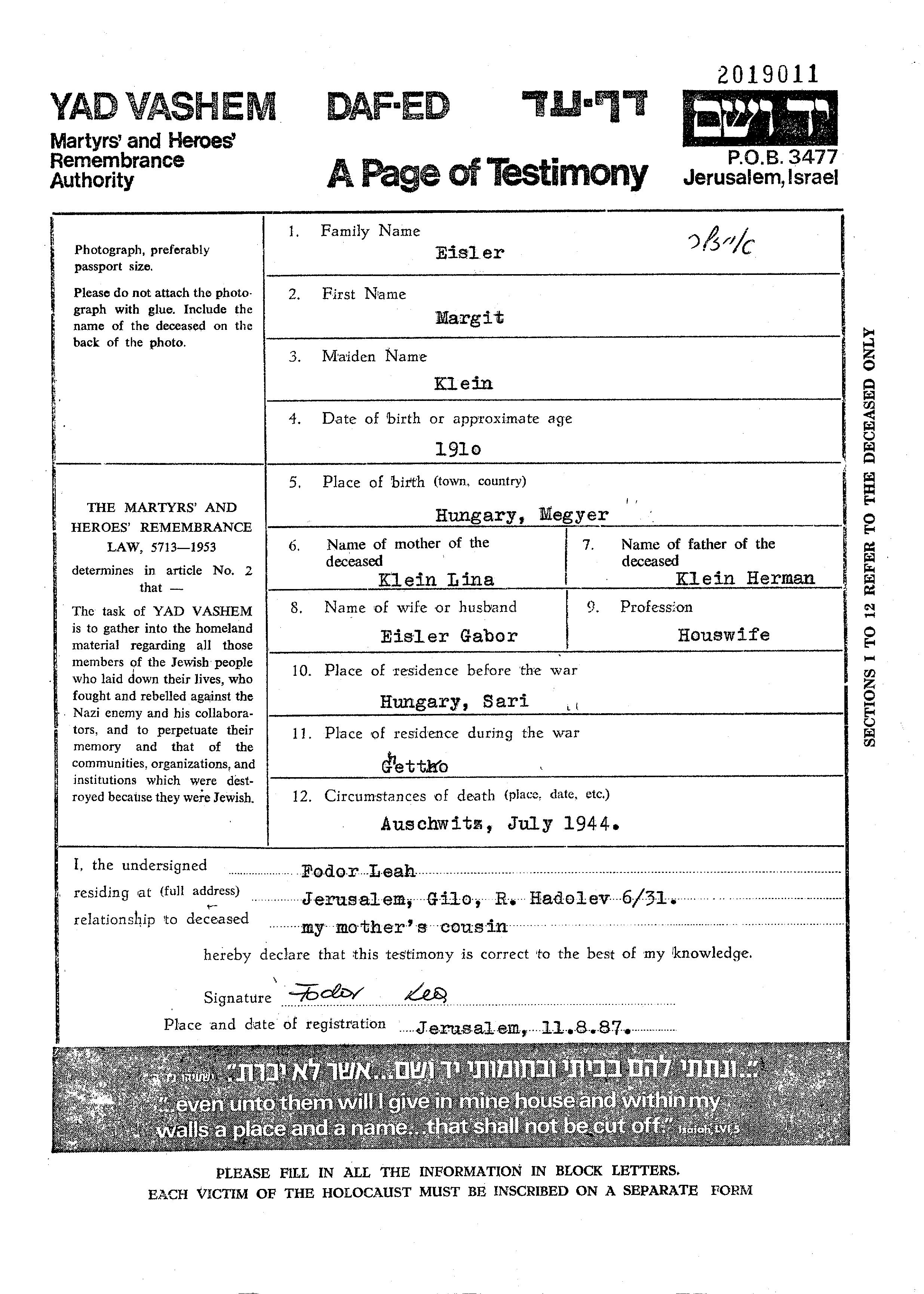 Маргит Эйслер, девичья фамилия Клейн, место рождения: Медьер, Венгрия. Отец: Херман, mать:Лина. Домохозяйка. Женат / замужем. Место жительства до войны: Шари, Венгрия. Место во время войны: ГЕТТО.