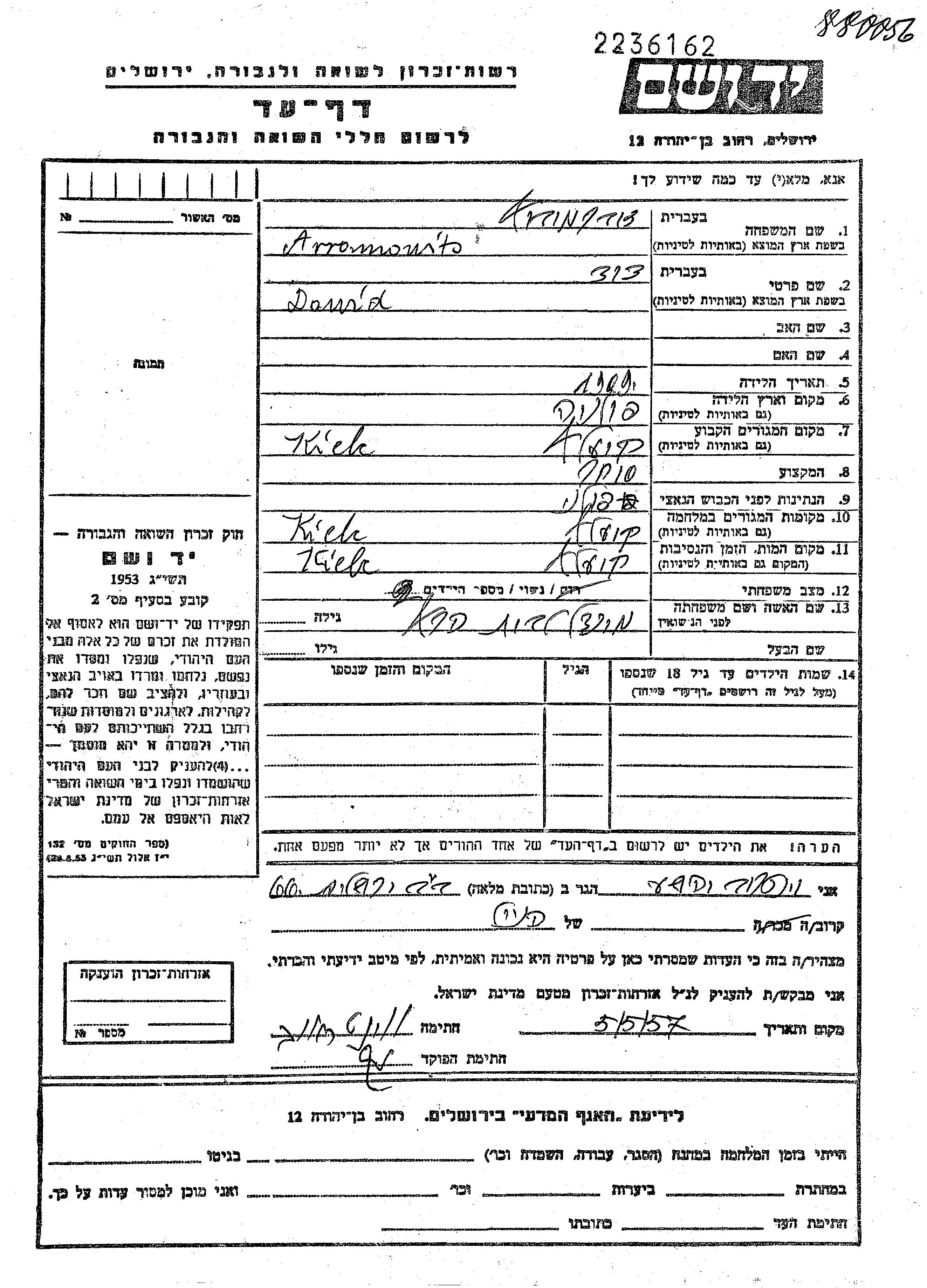 Абрамовиц Давид 1909 Кельце, Польша Лист свидетельских показаний