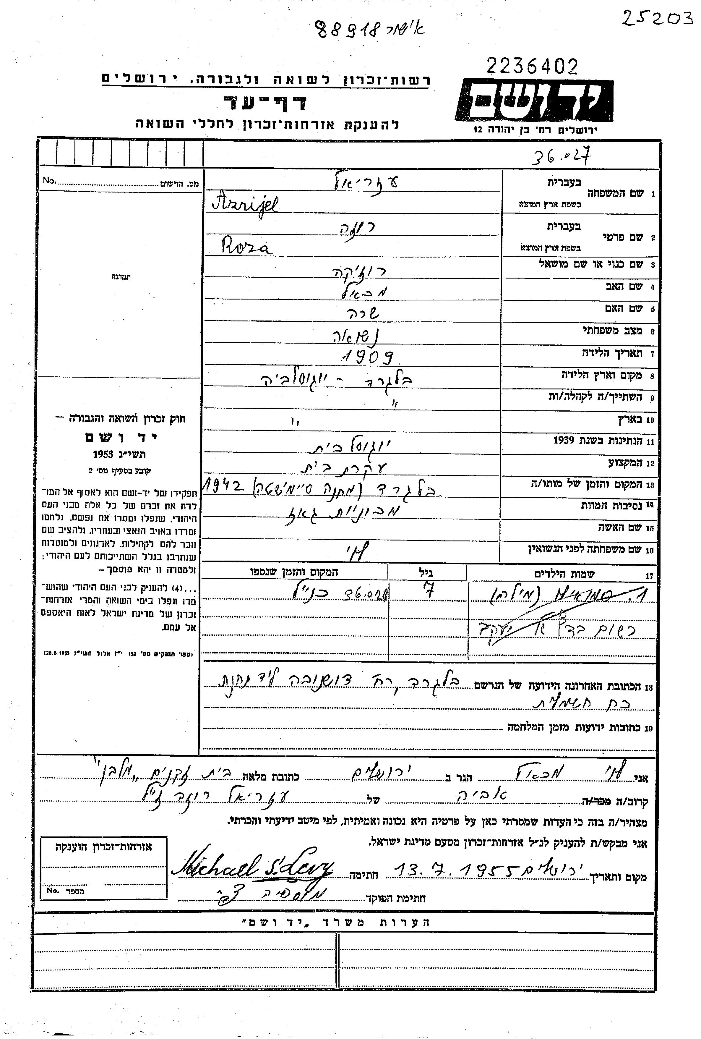 Азриель Роза 1909 Белград, Югославия Лист свидетельских показаний