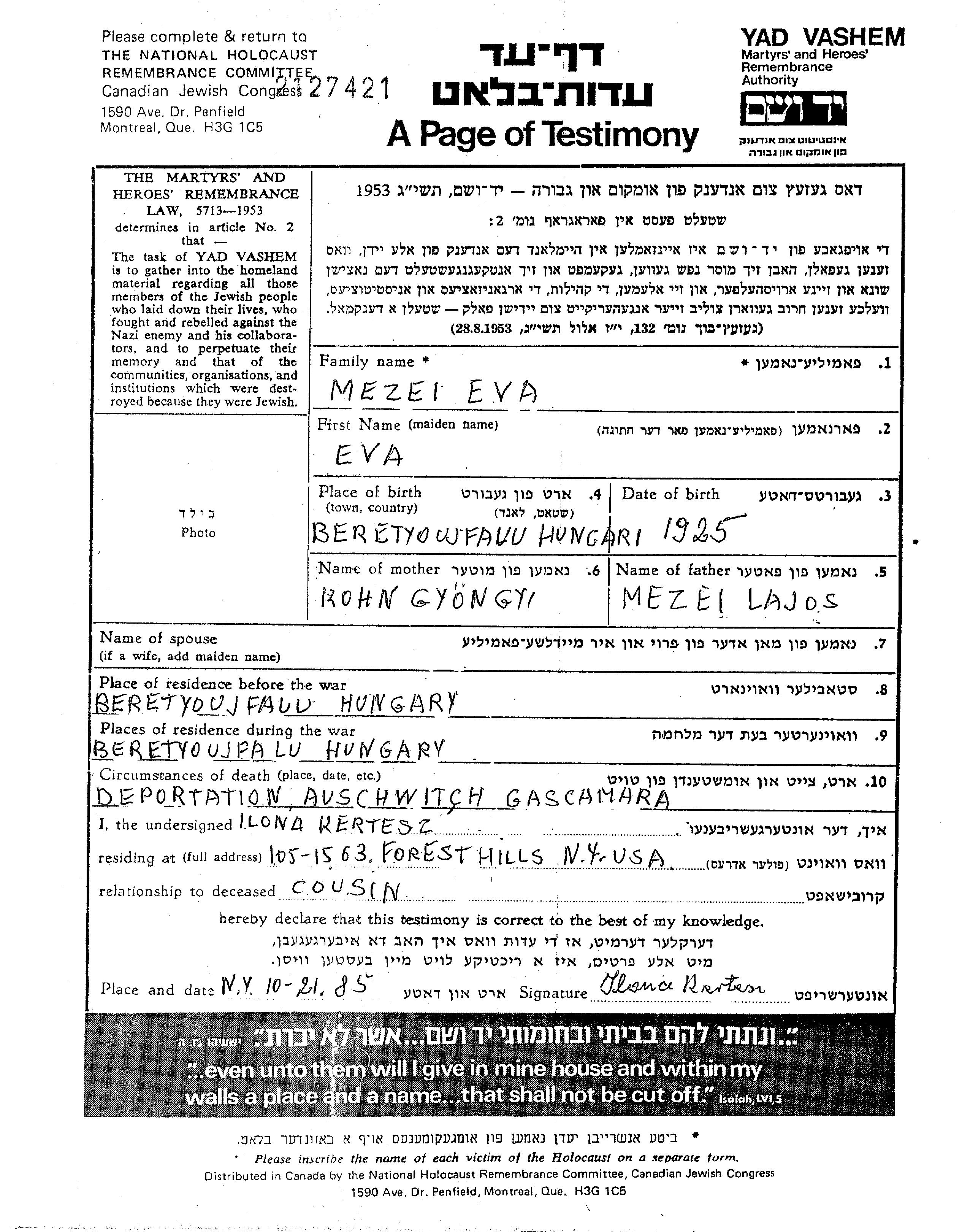 Эва Мезей, место рождения: Тольд, Венгрия. Отец: Лайош, mать:Джонджи, девичья фамилия Кон Кун. Холост / не замужем. Место жительства до войны: Тольд, Венгрия. Место во время войны: Тольд, Венгрия.