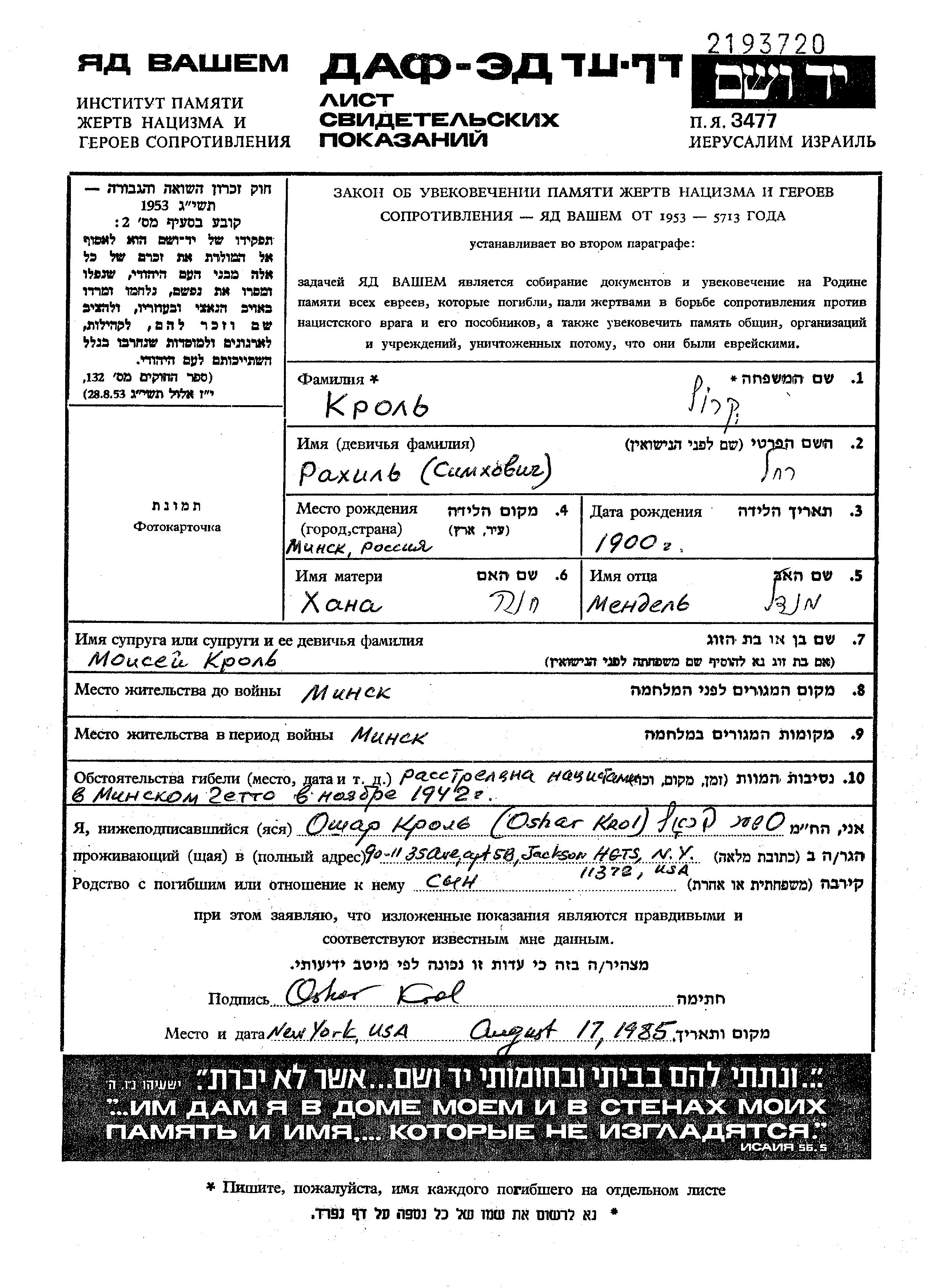 Кроль Рахиль 1900 Минск, Белоруссия (СССР) Лист свидетельских показаний