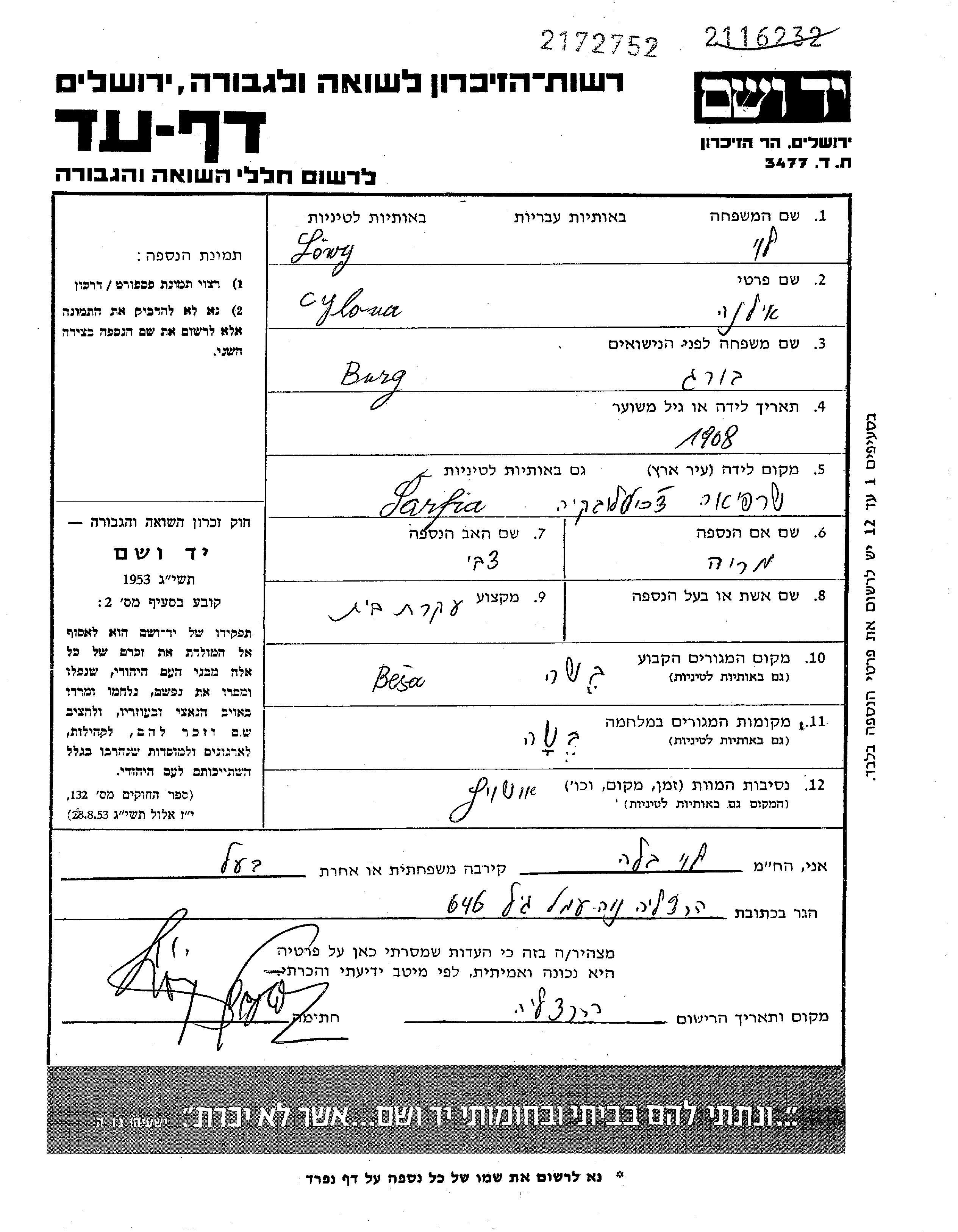 Илона Илана Лёви, девичья фамилия Бург, место рождения: Шарфия, Чехословакия. Отец: Цви, mать:Мария. Домохозяйка. Женат / замужем. Место жительства до войны: Беша, Чехословакия. Место во время войны: Беша, Чехословакия.