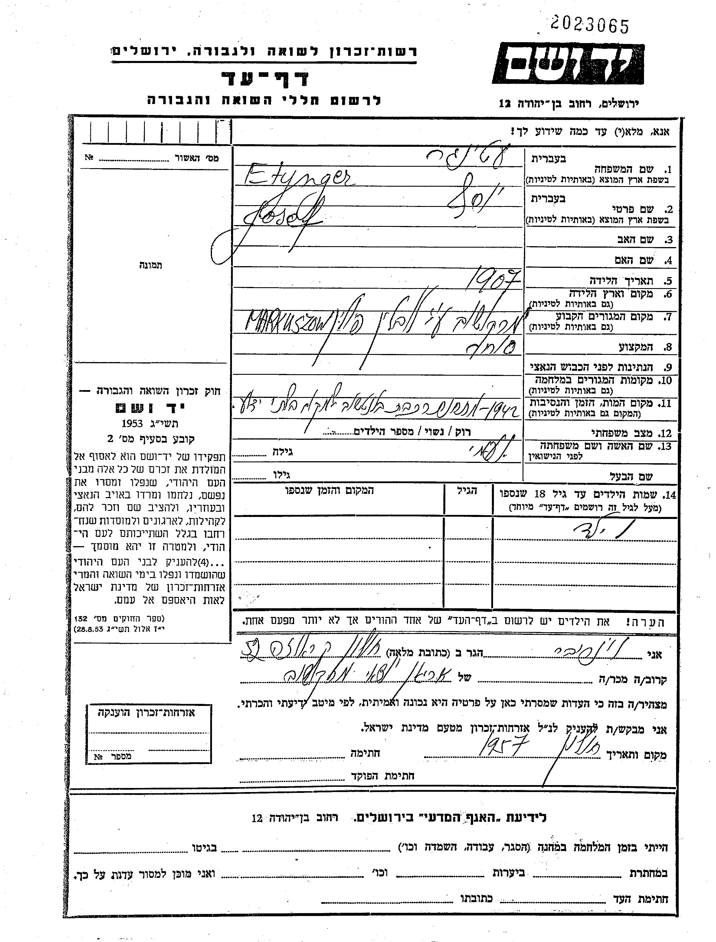 Этингер Йосеф 1907 место не указано, Лист свидетельских показаний