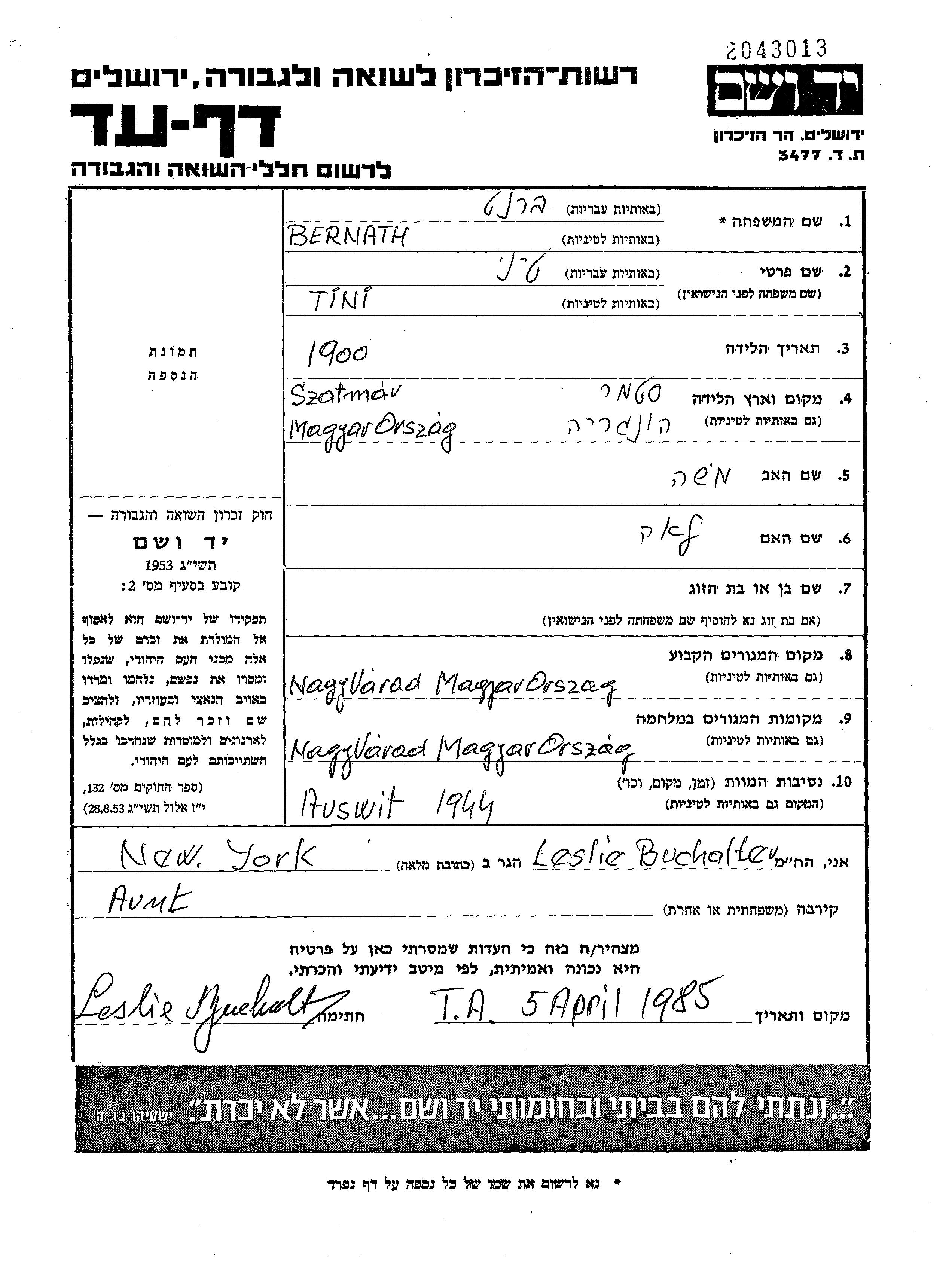 Тини Бернат, место рождения: Сатмар, Румыния. Отец: Моше, mать:Лея. Место жительства до войны: Надьварад, Румыния. Место во время войны: Надьварад, Румыния.