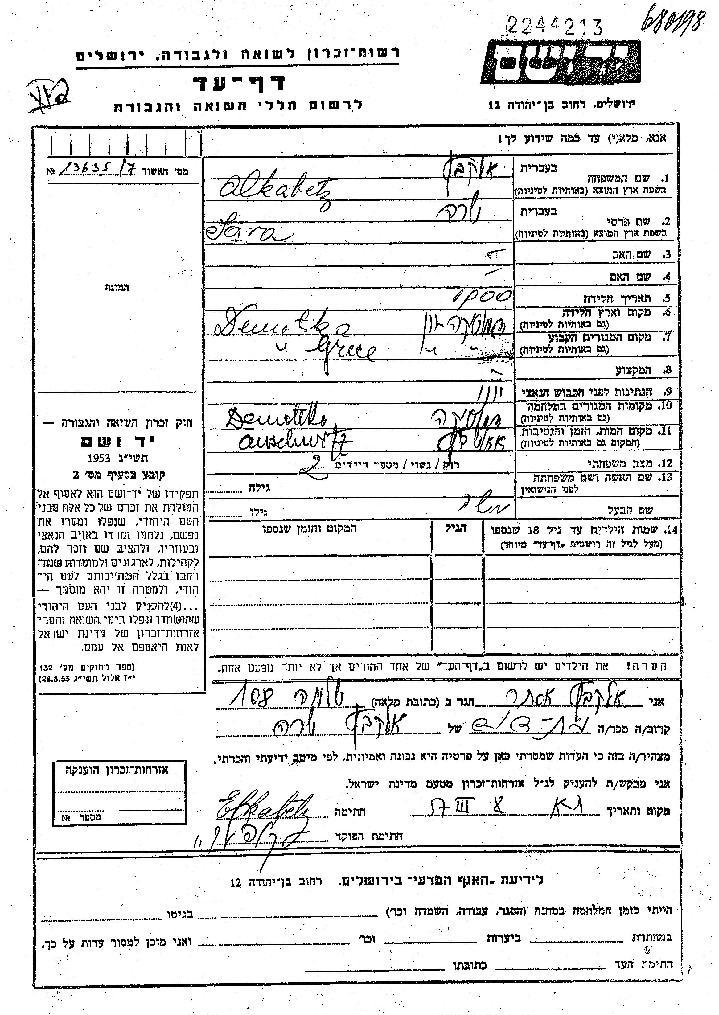 Сара Алькабец, место рождения: Дидимотихон, Греция. Женат / замужем. Место жительства до войны: Дидимотихон, Греция. Место во время войны: Дидимотихон, Греция.
