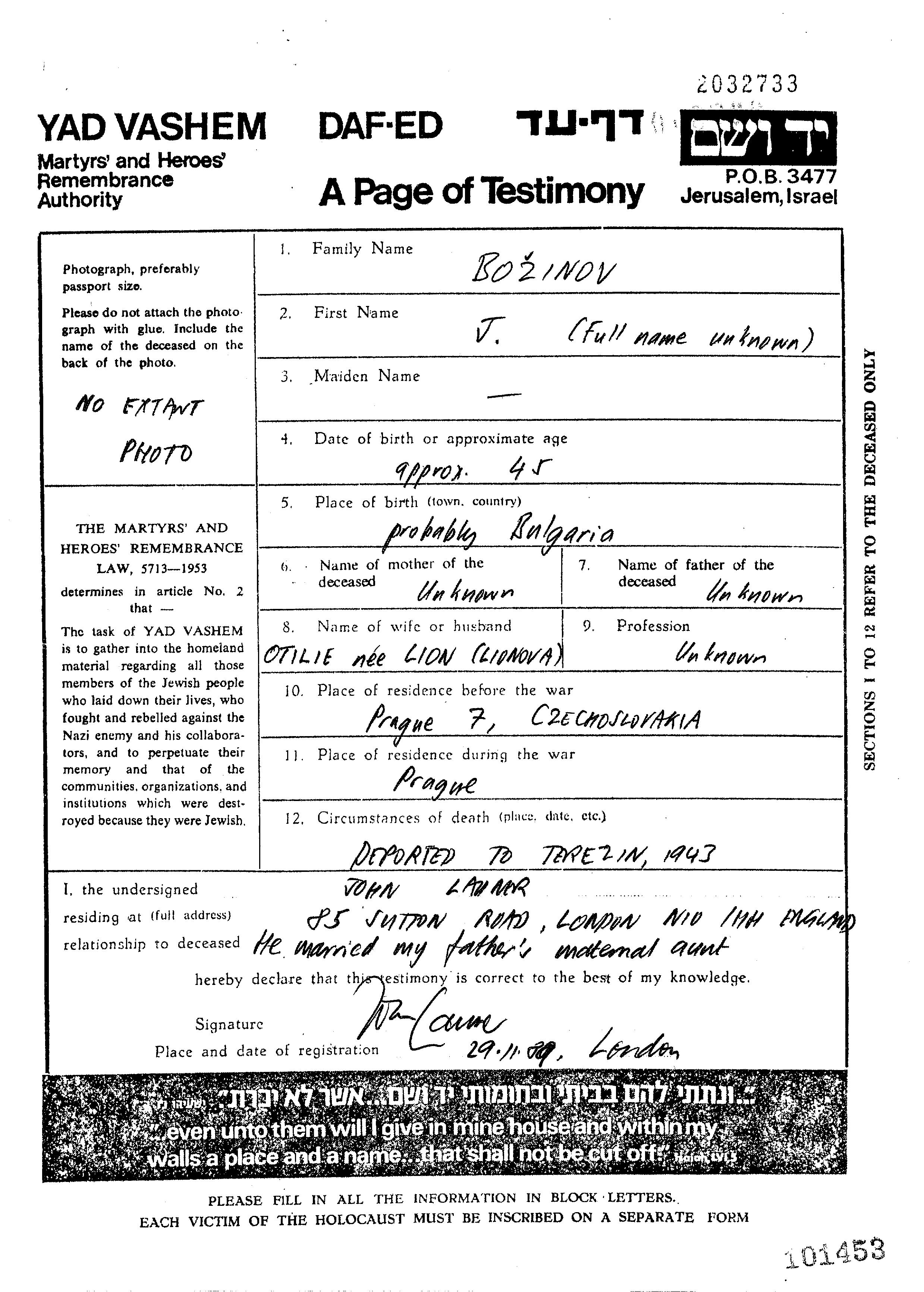 Г Божинов, место рождения: Болгария. Женат / замужем. Место жительства до войны: Прага, Чехословакия. Место во время войны: Прага, Чехословакия.