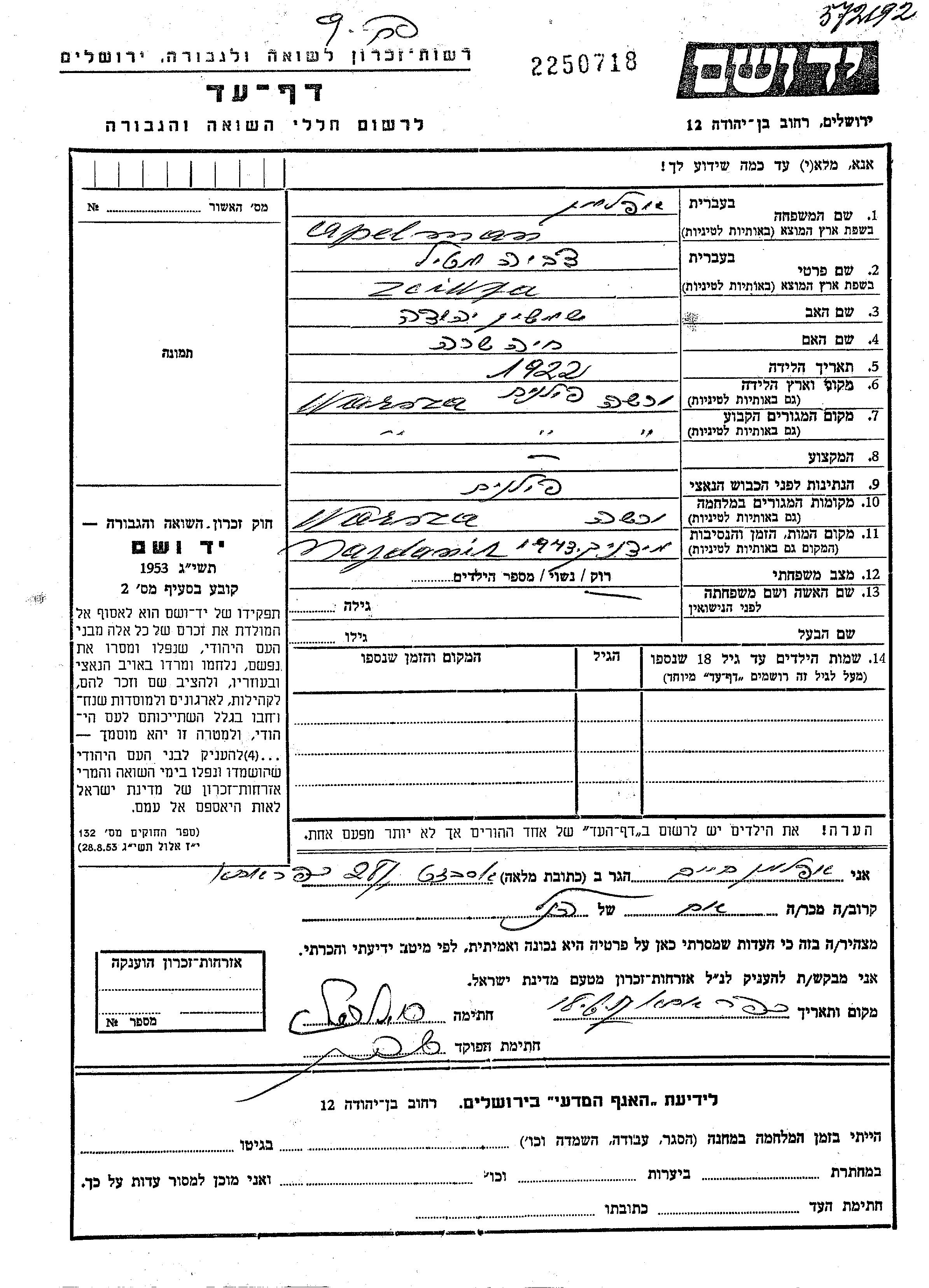 Яд Вашем - Листы свидетельских показаний Мемориального фонда
