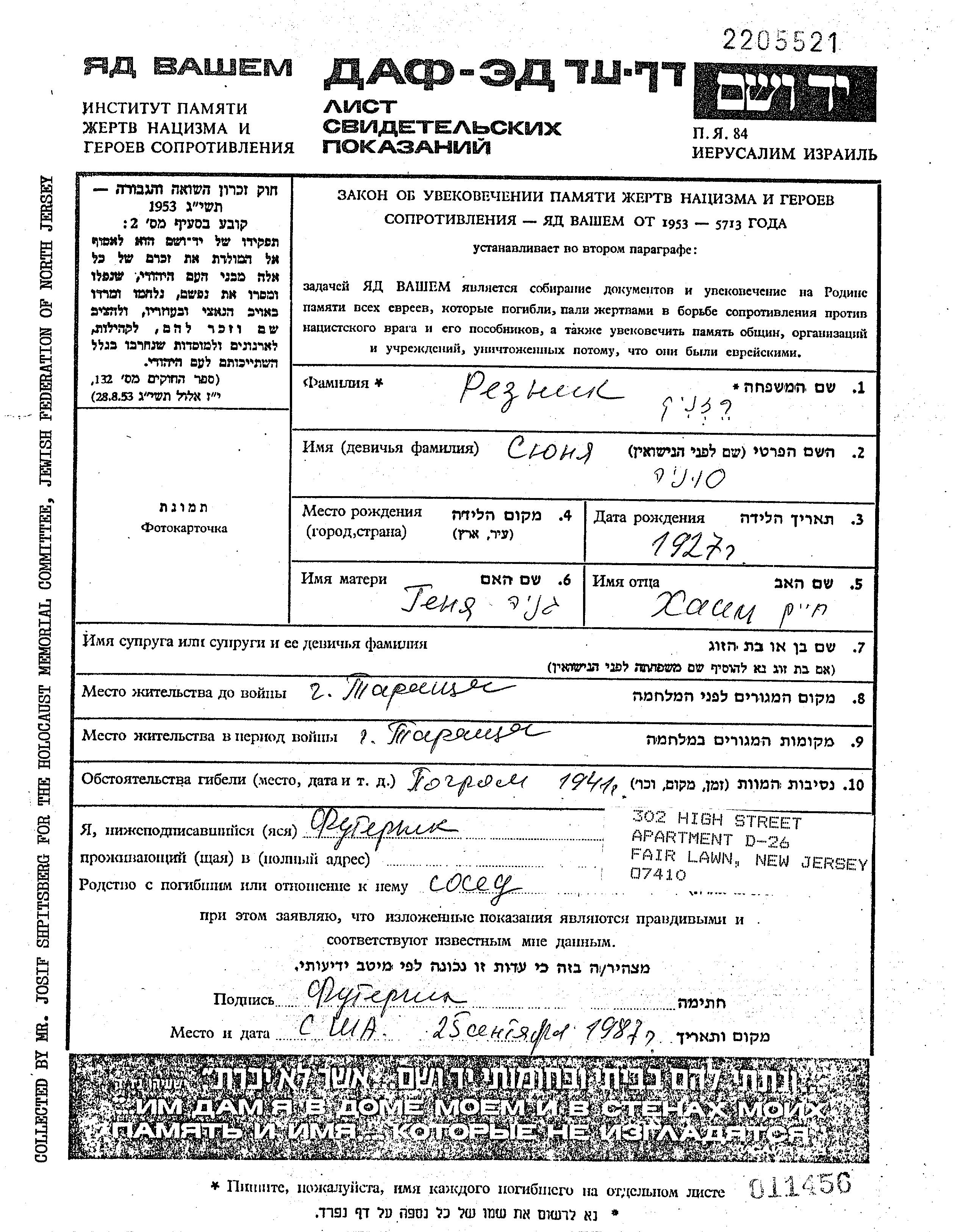 Резник Сюня Соня 1927 Тараща, Украина (СССР) Лист свидетельских показаний